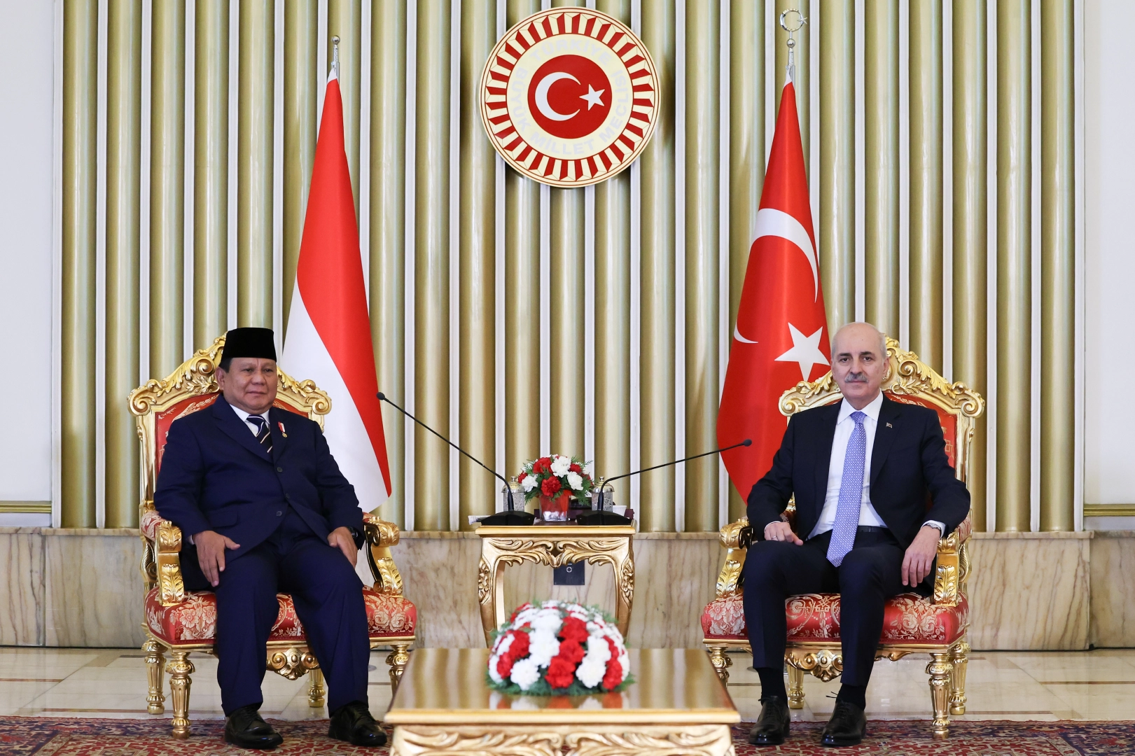 Aliekber METE/ANKARA, (DHA)- TBMM Başkanı Numan Kurtulmuş, Endonezya Cumhurbaşkanı Prabowo Subianto ile Meclis'teki makamında bir araya geldi. TBMM Başkanlığı'ndan yapılan açıklamaya göre; Meclis Başkanı Numan Kurtulmuş, Endonezya Cumhurbaşkanı Prabowo Subianto ile Meclis'te bir araya geldi. Kurtulmuş, Cumhurbaşkanı Subianto ve heyetini TBMM'de ağırlamaktan büyük memnuniyet duyduğunu belirtti ve ziyaretin iki ülke ilişkilerine olumlu katkı sunacağını söyledi. İki ülke arasında uzak mesafeler olmasına rağmen dostluk ilişkilerinin hiçbir zaman etkilenmediğini ifade eden Numan Kurtulmuş, hükümetler arasında var olan mükemmel ilişkilerin parlamentolar arasında da çok güçlü şekilde devamı için ortak bir iradeye sahip olduklarını ekledi. Kurtulmuş, dünyanın çok merkezli bir düzene doğru ilerlediğini ve Türkiye ile Endonezya'nın iki büyük Müslüman ülke olarak yeni düzenin en şanslı ülkelerinden olacağını vurguladı. Endonezya Cumhurbaşkanı Subianto ise Türkiye'nin Endonezya halkının kalbinde özel bir yerinin olduğunu ve iki ülke arasında sürmekte olan ilişkilerin güçlendirilmesi gerektiğini aktardı. Cumhurbaşkanı Recep Tayyip Erdoğan'ın liderliğinde Türkiye'nin, uluslararası arenada sürdürdüğü politikaların Müslüman dünya ve Endonezya için ilham kaynağı olduğunu vurgulayan Subianto, Filistin'de devam eden çatışmalarda Filistin halkının haklarını savunabilmek için Türkiye'nin duruşunun önemli olduğunun altını çizdi. (DHA)