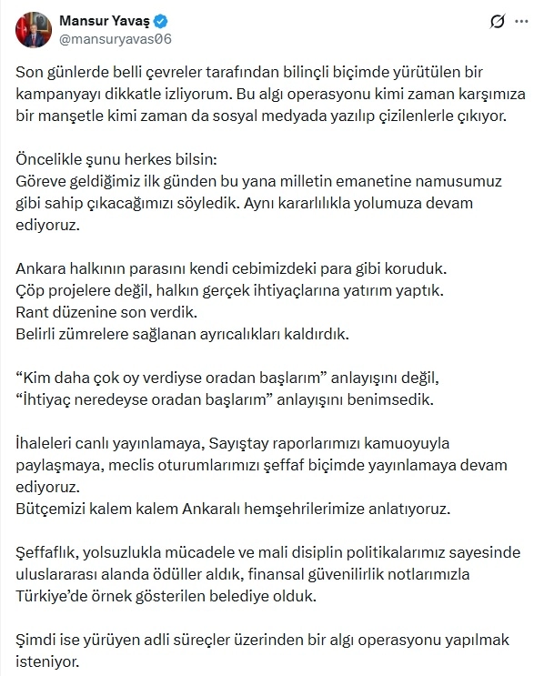 ABB Başkanı Mansur Yavaş, sanal medya hesabından yaptığı açıklamada, son günlerde belli çevreler tarafından kendisine yönelik bilinçli bir kampanya yürütüldüğünü belirterek, "Bu algı operasyonu kimi zaman karşımıza bir manşetle kimi zaman da sosyal medyada yazılıp çizilenlerle çıkıyor. Öncelikle şunu herkes bilsin, göreve geldiğimiz ilk günden bu yana milletin emanetine namusumuz gibi sahip çıkacağımızı söyledik. Aynı kararlılıkla yolumuza devam ediyoruz. Ankara halkının parasını kendi cebimizdeki para gibi koruduk. Çöp projelere değil, halkın gerçek ihtiyaçlarına yatırım yaptık. Rant düzenine son verdik. Belirli zümrelere sağlanan ayrıcalıkları kaldırdık. 'Kim daha çok oy verdiyse oradan başlarım' anlayışını değil, 'İhtiyaç neredeyse oradan başlarım' anlayışını benimsedik. İhaleleri canlı yayınlamaya, Sayıştay raporlarımızı kamuoyuyla paylaşmaya, meclis oturumlarımızı şeffaf biçimde yayınlamaya devam ediyoruz. Bütçemizi kalem kalem Ankaralı hemşehrilerimize anlatıyoruz. Şeffaflık, yolsuzlukla mücadele ve mali disiplin politikalarımız sayesinde uluslararası alanda ödüller aldık, finansal güvenilirlik notlarımızla Türkiye’de örnek gösterilen belediye olduk" dedi.
