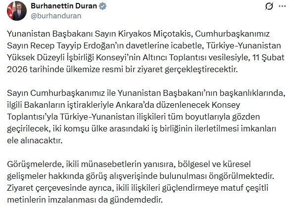 İletişim Başkanı Burhanettin Duran, sanal medya hesabından yaptığı açıklamada, "Yunanistan Başbakanı Sayın Kiryakos Miçotakis, Cumhurbaşkanımız Sayın Recep Tayyip Erdoğan’ın davetlerine icabetle, Türkiye-Yunanistan Yüksek Düzeyli İşbirliği Konseyi’nin Altıncı Toplantısı vesilesiyle, 11 Şubat 2026 tarihinde ülkemize resmi bir ziyaret gerçekleştirecektir. Sayın Cumhurbaşkanımız ile Yunanistan Başbakanı’nın başkanlıklarında, ilgili Bakanların iştirakleriyle Ankara’da düzenlenecek Konsey Toplantısı’yla Türkiye-Yunanistan ilişkileri tüm boyutlarıyla gözden geçirilecek, iki komşu ülke arasındaki iş birliğinin ilerletilmesi imkanları ele alınacaktır. Görüşmelerde, ikili münasebetlerin yanı sıra bölgesel ve küresel gelişmeler hakkında görüş alışverişinde bulunulması öngörülmektedir. Ziyaret çerçevesinde ayrıca, ikili ilişkileri güçlendirmeye matuf çeşitli metinlerin imzalanması da gündemdedir" ifadelerini kullandı. (DHA)