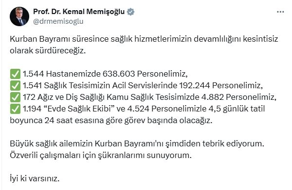 ANKARA, (DHA)- SAĞLIK Bakanı Kemal Memişoğlu, Kurban Bayramı boyunca 1544 hastanede 638 bin 603 personel ile sağlık hizmetlerinin kesintisiz olarak süreceğini açıkladı. Sağlık Bakanı Kemal Memişoğlu, bayram sürecindeki sağlık hizmetlerine ilişkin sosyal medya hesabından açıklama yaptı. Bakan Memişoğlu, "Kurban Bayramı süresince sağlık hizmetlerimizin devamlılığını kesintisiz olarak sürdüreceğiz. 1544 hastanemizde 638 bin 603 personelimiz, 1541 sağlık tesisimizin acil servislerinde 192 bin 244 personelimiz, 172 ağız ve diş sağlığı kamu sağlık tesisimizde 4 bin 882 personelimiz, 1194 evde sağlık ekibi ve 4 bin 524 personelimizle 4,5 günlük tatil boyunca 24 saat esasına göre görev başında olacağız. Büyük sağlık ailemizin Kurban Bayramı'nı şimdiden tebrik ediyorum. Özverili çalışmaları için şükranlarımı sunuyorum. İyi ki varsınız" ifadelerini kullandı. (DHA)