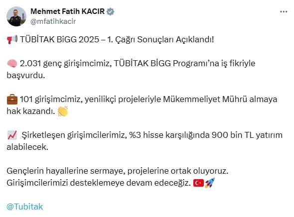 ANKARA, (DHA)- SANAYİ ve Teknoloji Bakanı Mehmet Fatih Kacır, Türkiye Bilimsel ve Teknolojik Araştırma Kurumu Bireysel Genç Girişim (TÜBİTAK BiGG) Programı 2025 yılı 1'inci çağrı sonuçlarının açıklandığını duyurdu.Sanayi ve Teknoloji Bakanı Mehmet Fatih Kacır, sosyal medya hesabından yaptığı açıklamada, "2025-1'inci çağrı sonuçları açıklandı. 2 bin 31 genç girişimcimiz, TÜBİTAK BiGG Programı'na iş fikriyle başvurdu. 101 girişimcimiz, yenilikçi projeleriyle Mükemmeliyet Mührü almaya hak kazandı. Şirketleşen girişimcilerimiz yüzde 3 hisse karşılığında 900 bin TL yatırım alabilecek. Gençlerin hayallerine sermaye, projelerine ortak oluyoruz. Girişimcilerimizi desteklemeye devam edeceğiz" dedi.Bakanlıktan yapılan açıklamaya göre; TÜBİTAK, BiGG programı ile genç ve yenilikçi girişimci adaylarının hayallerini gerçekleştiriyor. 2012 yılında başlatılan program kapsamında bugüne kadar yaklaşık 3 bin girişimci, şirketlerini kurarak iş fikirlerini hayata geçirdi. Başvuruda bulunan girişimciler, ayrıntılı bilgiye; 'https://eteydeb.tubitak.gov.tr/' adresinden giriş yaparak, sonuçlara ulaşabilecek. (DHA)