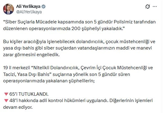 İçişleri Bakanı Ali Yerlikaya, polis tarafından düzenlenen operasyonları sanal medya hesabından duyurdu. Adana, Adıyaman, Aydın, Bolu, Çanakkale, Denizli, Düzce, Gaziantep, Giresun, Gümüşhane, İstanbul, İzmir, Kayseri, Kırşehir, Kocaeli, Mardin, Sakarya, Samsun ve Van’da 'Nitelikli dolandırıcılık, çevrim içi çocuk müstehcenliği ve tacizi, yasa dışı bahis' suçlarına yönelik operasyonlar düzenlendi. Son 5 gündür süren operasyonlarda 200 şüpheli gözaltına alındı. Şüphelilerin; 65’i tutuklandı, 48’i hakkında adli kontrol hükümleri uygulandı. Diğerlerinin işlemleri devam ediyor. Şüphelilerin, sosyal medya platformları ve oltalama (phishing) siteleri üzerinden 'Görev yap kazanç sağla ve ürün satışı' temalarını kullanarak vatandaşları dolandırdıkları, mobil bankacılık ve oyun hesaplarına yetkisiz erişim sağladıkları, yasa dışı bahis ve kumar oynattıkları, yasa dışı bahis sitelerinde para nakline aracılık ettikleri ve reklamını yaptıkları, müstehcen çocuk görüntüsü barındırdıkları, pos tefeciliği yaptıkları, kişisel verilerin paylaşımı ve sorgulama konularında paylaşımlar yaptıkları tespit edildi.