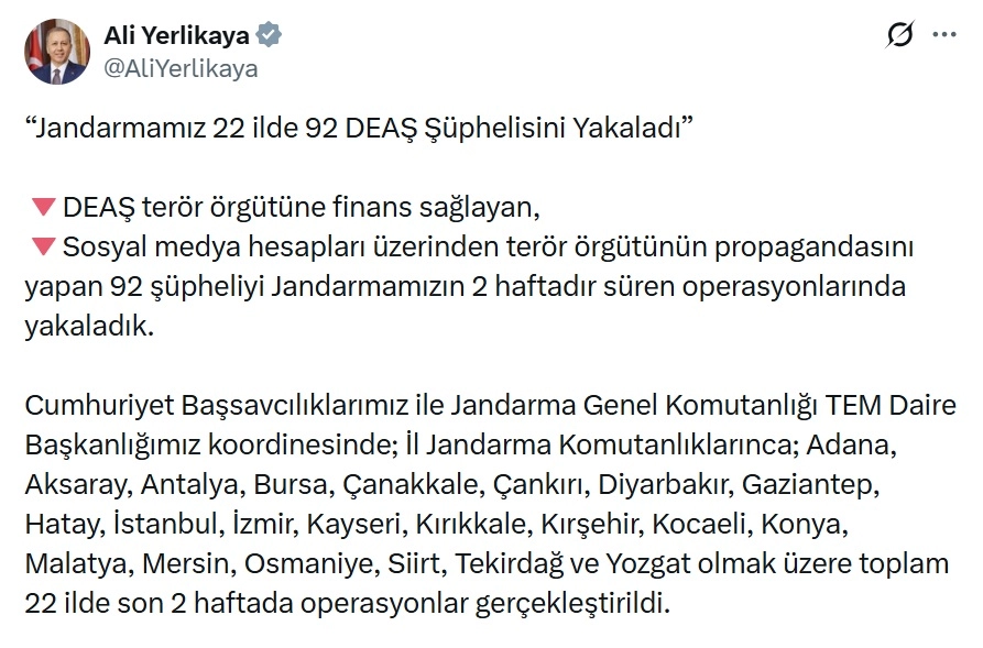 Bakan Yerlikaya'nın sosyal medya hesabından yaptığı açıklamaya göre; DEAŞ terör örgütüne finans sağlayan, sosyal medya hesapları üzerinden terör örgütünün propagandasını yapan 92 şüpheli jandarmanın 2 haftadır süren operasyonlarıyla yakalandı. Yerlikaya, operasyonlara katılan personeli tebrik ederek, "Ülkemizin her bölgesinde huzuru ve istikrarı sağlamak için yılın 365 günü, gece gündüz yürüttüğümüz operasyonlarımıza devam ediyoruz" dedi. (DHA)