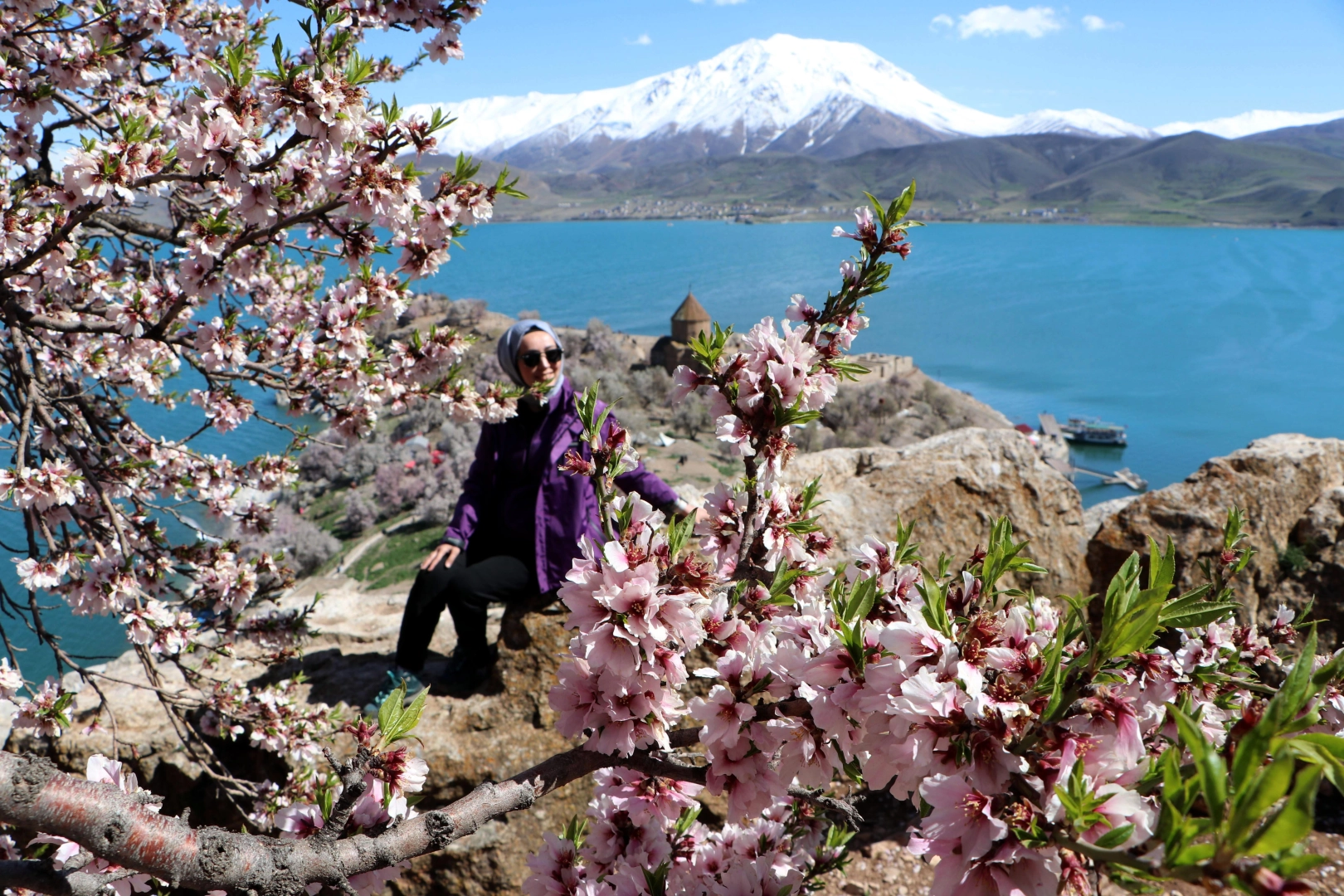 Gülay KUYUCU/VAN, (DHA)- VAN Gölü'nde bulunan ve badem ağaçlarının çiçeklerinin açmasıyla pembe ve beyaza bürünen . Manzarayı görmek isteyenler adaya gelip, bol bol fotoğraf çektirdi.Yılın her mevsimi ziyaretçilerin ilgi odağı olan Van Gölü'ndeki Akdamar Adası, bu sene 3'üncüsü düzenlenen 'Badem Çiçeği Festivali'ne ev sahipliği yapıyor. Valilik, Büyükşehir Belediyesi, İl Kültür ve Turizm Müdürlüğü öncülüğünde iki gün sürecek festival için yurdun dört bir yanından ziyaretçiler, kente geldi. Gevaş ilçesinden 20 dakikalık tekne yolcuğunun ardından adaya ulaşan ziyaretçileri, turkuaz rengindeki göl, dağlardaki karlar ve adada açan badem çiçekleriyle güzel manzara karşıladı. Festivalde kano ve yelken gösterileri, şiir dinletileri, halk oyunları gösterisi, konser, yöresel yemek ikramı gibi çeşitli etkinlikler düzenlendi. Ayrıca, festival kapsamında foto safari ile adaya gelen fotoğraf tutkunları, Akdamar Adası'nda fotoğraflar çekecek.'DOĞAL ZENGİNLİKLER'Saygı duruşu ve İstiklal Marşı’nın okunmasının ardından başlayan festivalde konuşan Van Vali Yardımcısı İbrahim Gültekin, "Burada olmaktan mutluluk duyuyorum. Hep birlikte bu güzel günün keyfini yaşayacağız. Daha sonraki yıllarda ilimiz bu tür etkinliklere ev sahipliği yaparak, kentin sahip olduğu kültürel değerleri ve doğal zenginliklerini tanıtmayı hedefliyoruz. Bu etkinlikte emeği geçen herkese teşekkür ederim" dedi.Gevaş Kaymakamı Bayram Yıldız ise, "Anadolu'da baharda ilk açan çiçeklerin coğrafyamızda olması ve bu eşsiz güzelliği birlikte takip etmemiz ayrıca önem arz ediyor. Van'ımız, farklılıklarıyla ön plana çıkmaktadır. Baharın ilk aylarında çiçek açan bademlerin Akdamar Adası ile birleşip festivalin düzenlenmesinin de ayrı bir önemi var. Bu adada badem çiçekleri yılın belli döneminde renkleriyle dünyaya bir görsel şölen sunuyor" diye konuştu.Kültür ve Turizm İl Müdürü Abdurrahman Şahin ise Van Gölü'nün eşsiz güzelliğiyle çevrelenen Akdamar Adası'nda festivali düzenlemenin mutluluğunu yaşadığını söyledi. (DHA)