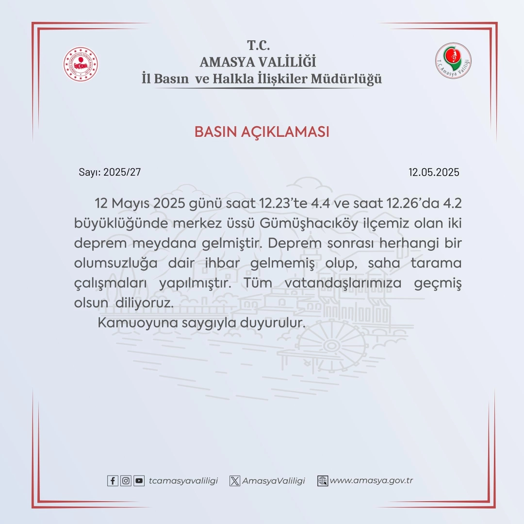 3 İLÇEDE OKULLAR TATİL EDİLDİAmasya Valiliği, Gümüşhacıköy ilçesinde 3 dakika arayla 4.4 ve 4.2 büyüklüğünde meydana gelen iki depreme ilişkin açıklama yaptı. Açıklamada, “12 Mayıs 2025 günü saat 12.23’te 4.4 ve saat 12.26’da 4.2 büyüklüğünde merkez üssü Gümüşhacıköy ilçemiz olan iki deprem meydana gelmiştir. Deprem sonrası herhangi bir olumsuzluğa dair ihbar gelmemiş olup saha tarama çalışmaları yapılmıştır. Tüm vatandaşlarımıza geçmiş olsun diliyoruz” denildi.Deprem nedeniyle Gümüşhacıköy, Merzifon ve Hamamözü ilçelerinde eğitime 1 gün ara verildi. (DHA)