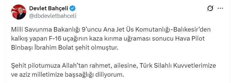 MHP Lideri Devlet Bahçeli, sanal medya hesabından yayımladığı mesajda, "Milli Savunma Bakanlığı 9'uncu Ana Jet Üs Komutanlığı-Balıkesir'den kalkış yapan F-16 uçağının kaza kırıma uğraması sonucu Hava Pilot Binbaşı İbrahim Bolat şehit olmuştur. Şehit pilotumuza Allah'tan rahmet, ailesine, Türk Silahlı Kuvvetlerimize ve aziz milletimize başsağlığı diliyorum" dedi. (DHA)