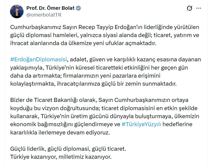 Bakan Bolat, sanal medya hesabından yaptığı açıklamada, "Cumhurbaşkanımız Sayın Recep Tayyip Erdoğan'ın liderliğinde yürütülen güçlü diplomasi hamleleri, yalnızca siyasi alanda değil; ticaret, yatırım ve ihracat alanlarında da ülkemize yeni ufuklar açmaktadır. Erdoğan diplomasisi, adalet, güven ve karşılıklı kazanç esasına dayanan yaklaşımıyla, Türkiye'nin küresel ticaretteki etkinliğini her geçen gün daha da artırmakta; firmalarımızın yeni pazarlara erişimini kolaylaştırmakta, ihracatçılarımıza güçlü bir zemin sunmaktadır. Bizler de Ticaret Bakanlığı olarak, Sayın Cumhurbaşkanımızın ortaya koyduğu bu vizyon doğrultusunda; ticaret diplomasisini en etkin şekilde kullanarak, Türkiye'nin üretim gücünü dünyayla buluşturmaya, ülkemizin ekonomik bağımsızlığını güçlendirmeye ve Türkiye Yüzyılı hedeflerine kararlılıkla ilerlemeye devam ediyoruz. Güçlü liderlik, güçlü diplomasi, güçlü ticaret. Türkiye kazanıyor, milletimiz kazanıyor" ifadelerini kullandı. (DHA)