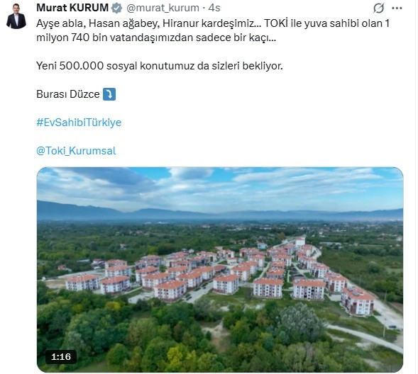 ANKARA, (DHA)- ÇEVRE, Şehircilik ve İklim Değişikliği Bakanı Murat Kurum, Toplu Konut İdaresi Başkanlığı'nın (TOKİ) 'İlk Evim Projesi' kapsamında Düzce'de ev sahibi olanların görüntülerini paylaşarak, "Yeni 500 bin sosyal konutumuz da sizleri bekliyor" dedi.