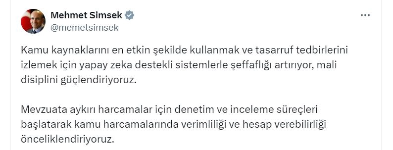 ANKARA, (DHA)- HAZİNE ve Maliye Bakanı Mehmet Şimşek, "Mevzuata aykırı harcamalar için denetim ve inceleme süreçleri başlatarak kamu harcamalarında verimliliği ve hesap verebilirliği önceliklendiriyoruz" dedi.Bakan Şimşek, sosyal medya hesabından yaptığı açıklamada, "Kamu kaynaklarını en etkin şekilde kullanmak ve tasarruf tedbirlerini izlemek için yapay zeka destekli sistemlerle şeffaflığı artırıyor, mali disiplini güçlendiriyoruz. Mevzuata aykırı harcamalar için denetim ve inceleme süreçleri başlatarak kamu harcamalarında verimliliği ve hesap verebilirliği önceliklendiriyoruz" ifadelerini kullandı. (DHA)