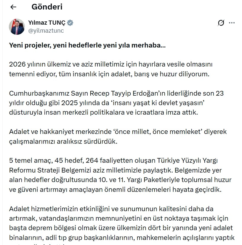 Adalet Bakanı Yılmaz Tunç, sanal medya hesabından paylaştığı yeni yıl mesajında, "2026 yılının ülkemiz ve aziz milletimiz için hayırlara vesile olmasını temenni ediyor, tüm insanlık için adalet, barış ve huzur diliyorum. Cumhurbaşkanımız Sayın Recep Tayyip Erdoğan’ın liderliğinde son 23 yıldır olduğu gibi 2025 yılında da ‘insanı yaşat ki devlet yaşasın’ düsturuyla insan merkezli politikalara ve icraatlara imza attık. Adalet ve hakkaniyet merkezinde ‘önce millet, önce memleket’ diyerek çalışmalarımızı aralıksız sürdürdük. 5 temel amaç, 45 hedef, 264 faaliyetten oluşan Türkiye Yüzyılı Yargı Reformu Strateji Belgemizi aziz milletimizle paylaştık. Belgemizde yer alan hedefler doğrultusunda 10'uncu ve 11'inci Yargı Paketleriyle toplumsal huzur ve güveni artırmayı amaçlayan önemli düzenlemeleri hayata geçirdik. Adalet hizmetlerimizin etkinliğini ve sunumunun kalitesini daha da artırmak, vatandaşlarımızın memnuniyetini en üst noktaya taşımak için başta deprem bölgesi olmak üzere ülkemizin dört bir yanında yeni adalet binalarının, adli tıp grup başkanlıklarının, mahkemelerin açılışlarını yaptık ve temellerini attık" dedi.