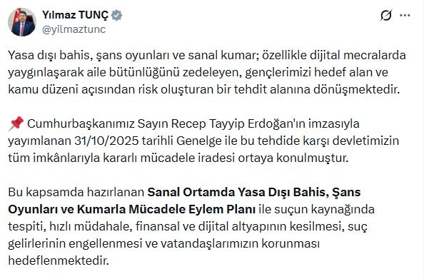 Adalet Bakanı Yılmaz Tunç, yasa dışı bahis, şans oyunu ve sanal kumar suçlarına ilişkin sosyal medya hesabından açıklama yaptı. Bakan Tunç, "Yasa dışı bahis, şans oyunları ve sanal kumar; özellikle dijital mecralarda yaygınlaşarak aile bütünlüğünü zedeleyen, gençlerimizi hedef alan ve kamu düzeni açısından risk oluşturan bir tehdit alanına dönüşmektedir. Cumhurbaşkanımız Sayın Recep Tayyip Erdoğan'ın imzasıyla yayımlanan 31 Ekim 2025 tarihli genelge ile bu tehdide karşı devletimizin tüm imkanlarıyla kararlı mücadele iradesi ortaya konulmuştur. Bu kapsamda hazırlanan Sanal Ortamda Yasa Dışı Bahis, Şans Oyunları ve Kumarla Mücadele Eylem Planı ile suçun kaynağında tespiti, hızlı müdahale, finansal ve dijital altyapının kesilmesi, suç gelirlerinin engellenmesi ve vatandaşlarımızın korunması hedeflenmektedir. Bu suçlarla mücadelede hukuki ve idari altyapının güçlendirilmesi, denetim ve yaptırım mekanizmalarının etkinleştirilmesi ve kurumlar arası koordinasyonun artırılması esas alınarak kamu kurumlarının sorumlulukları da belirlenmiştir" ifadelerini kullandı.