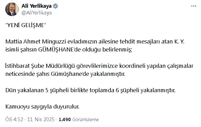 ANKARA, (DHA)- İÇİŞLERİ Bakanı Ali Yerlikaya, İstanbul Kadıköy'de bıçaklanarak öldürülen Mattia Ahmet Minguzzi'nin ailesine tehdit mesajları atan 6 şüphelinin yakalandığını açıkladı. İçişleri Bakanı Ali Yerlikaya, sosyal medya hesabından yaptığı açıklamada, "Mattia Ahmet Minguzzi evladımızın ailesine tehdit mesajları atan K.Y. isimli şahsın Gümüşhane'de olduğu belirlenmiş; İstihbarat Şube Müdürlüğü görevlilerimizce koordineli yapılan çalışmalar neticesinde şahıs Gümüşhane'de yakalanmıştır. Dün yakalanan 5 şüpheli birlikte toplamda 6 şüpheli yakalanmıştır" ifadelerini kullandı. Bakan Yerlikaya, sosyal medya hesabından dün yaptığı açıklamada, Mattia Ahmet Minguzzi cinayeti davası ile ilgili sosyal medya hesaplarından failleri öven ve aileye tehdit içerikli mesajları veren 5 şüphelinin gözaltına alındığını duyurmuştu. (DHA)