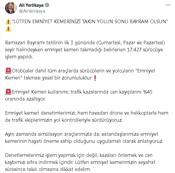 Umutcan ÖREN/ANKARA, (DHA)- İÇİŞLERİ Bakanı Ali Yerlikaya, Ramazan Bayramı tatilinin ilk 3 gününde (cumartesi, pazar ve pazartesi) seyir halindeyken emniyet kemeri takmadığı belirlenen 17 bin 427 sürücüye işlem yapıldığını açıkladı.İçişleri Bakanı Ali Yerlikaya, sosyal medya hesabından yaptığı açıklamada, "Lütfen emniyet kemerinizi takın yolun sonu bayram olsun. Ramazan Bayramı tatilinin ilk 3 gününde (Cumartesi, Pazar ve Pazartesi) seyir halindeyken emniyet kemeri takmadığı belirlenen 17 bin 427 sürücüye işlem yapıldı. Otobüsler dahil tüm araçlarda sürücülerin ve yolcuların 'emniyet kemeri' takması yasal bir zorunluluktur. Emniyet Kemeri kullanımı; trafik kazalarında can kayıplarını yüzde 45 oranında azaltıyor. Emniyet kemeri denetimlerimizi; hem havadan drone ve helikopterle hem de trafik ekiplerimizin yol kontrolleriyle sürdürüyoruz. Aynı zamanda simülasyon araçlarımızla da; vatandaşlarımıza emniyet kemerinin hayati öneme sahip olduğunu uygulamalı olarak anlatıyoruz. Denetlemelerimiz işlem yapmak için değil, kazaları önlemek ve can kaybımızı sıfıra indirmek içindir. Lütfen emniyet kemerimizin seyahat süresince takılı olmasına dikkat edelim" dedi. (DHA)