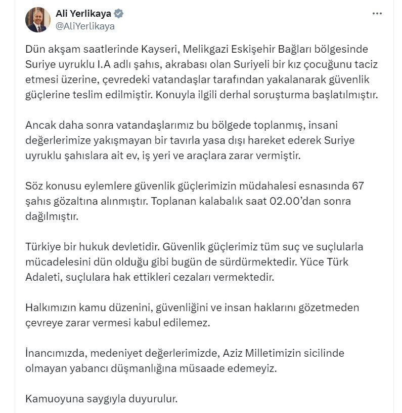 Aliekber METE/ANKARA,(DHA)- İÇİŞLERİ Bakanı Ali Yerlikaya, Kayseri'nin Melikgazi ilçesinde Suriye uyruklu bir kişinin 7 yaşındaki çocuğu taciz ettiği iddialarının ardından yaşanan olaylara ilişkin, "Konuyla ilgili derhal soruşturma başlatılmıştır. Ancak daha sonra vatandaşlarımız bu bölgede toplanmış, insani değerlerimize yakışmayan bir tavırla yasa dışı hareket ederek Suriye uyruklu şahıslara ait ev, iş yeri ve araçlara zarar vermiştir. Söz konusu eylemlere güvenlik güçlerimizin müdahalesi esnasında 67 şahıs gözaltına alınmıştır" dedi.Bakan Yerlikaya, dün akşam Kayseri'nin Melikgazi ilçesinde Suriye uyruklu bir kişinin 7 yaşındaki çocuğu taciz ettiği iddiasının ardından çıkan olaylar ile ilgili sosyal medya hesabından açıklama yaptı. Yerlikaya, "Dün akşam saatlerinde Kayseri, Melikgazi Eskişehir Bağları bölgesinde Suriye uyruklu I.A adlı şahıs, akrabası olan Suriyeli bir kız çocuğunu taciz etmesi üzerine, çevredeki vatandaşlar tarafından yakalanarak güvenlik güçlerine teslim edilmiştir. Konuyla ilgili derhal soruşturma başlatılmıştır. Ancak daha sonra vatandaşlarımız bu bölgede toplanmış, insani değerlerimize yakışmayan bir tavırla yasa dışı hareket ederek Suriye uyruklu şahıslara ait ev, iş yeri ve araçlara zarar vermiştir. Söz konusu eylemlere güvenlik güçlerimizin müdahalesi esnasında 67 şahıs gözaltına alınmıştır. Toplanan kalabalık saat 02.00'dan sonra dağılmıştır" dedi. 'YABANCI DÜŞMANLIĞINA MÜSAADE EDEMEYİZ'Yerlikaya, Türkiye'nin bir hukuk devleti olduğunu vurgulayarak, "Güvenlik güçlerimiz tüm suç ve suçlularla mücadelesini dün olduğu gibi bugün de sürdürmektedir. Yüce Türk Adaleti, suçlulara hak ettikleri cezaları vermektedir. Halkımızın kamu düzenini, güvenliğini ve insan haklarını gözetmeden çevreye zarar vermesi kabul edilemez. İnancımızda, medeniyet değerlerimizde, aziz milletimizin sicilinde olmayan yabancı düşmanlığına müsaade edemeyiz" açıklamasında bulundu. (DHA)