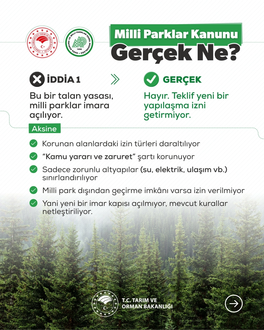 Tarım ve Orman Bakanlığı sanal medya hesabından paylaşım yaparak, Milli Parklar Kanunu teklifi hakkında sosyal medya ve bazı yayın organlarında yer alan, ‘Bu bir talan yasası, milli parklar imara açılıyor’ iddiaları üzerine açıklama yaptı. Açıklamada, kanun teklifinin yeni bir yapılaşma izni getirmediği vurgulandı, mevcut düzenlemelerin daha açık ve net hale getirildiği ifade edildi. Bu kapsamda, korunan alanlardaki izin türlerinin daraltıldığı, ‘kamu yararı ve zaruret’ şartının korunduğu kaydedildi.