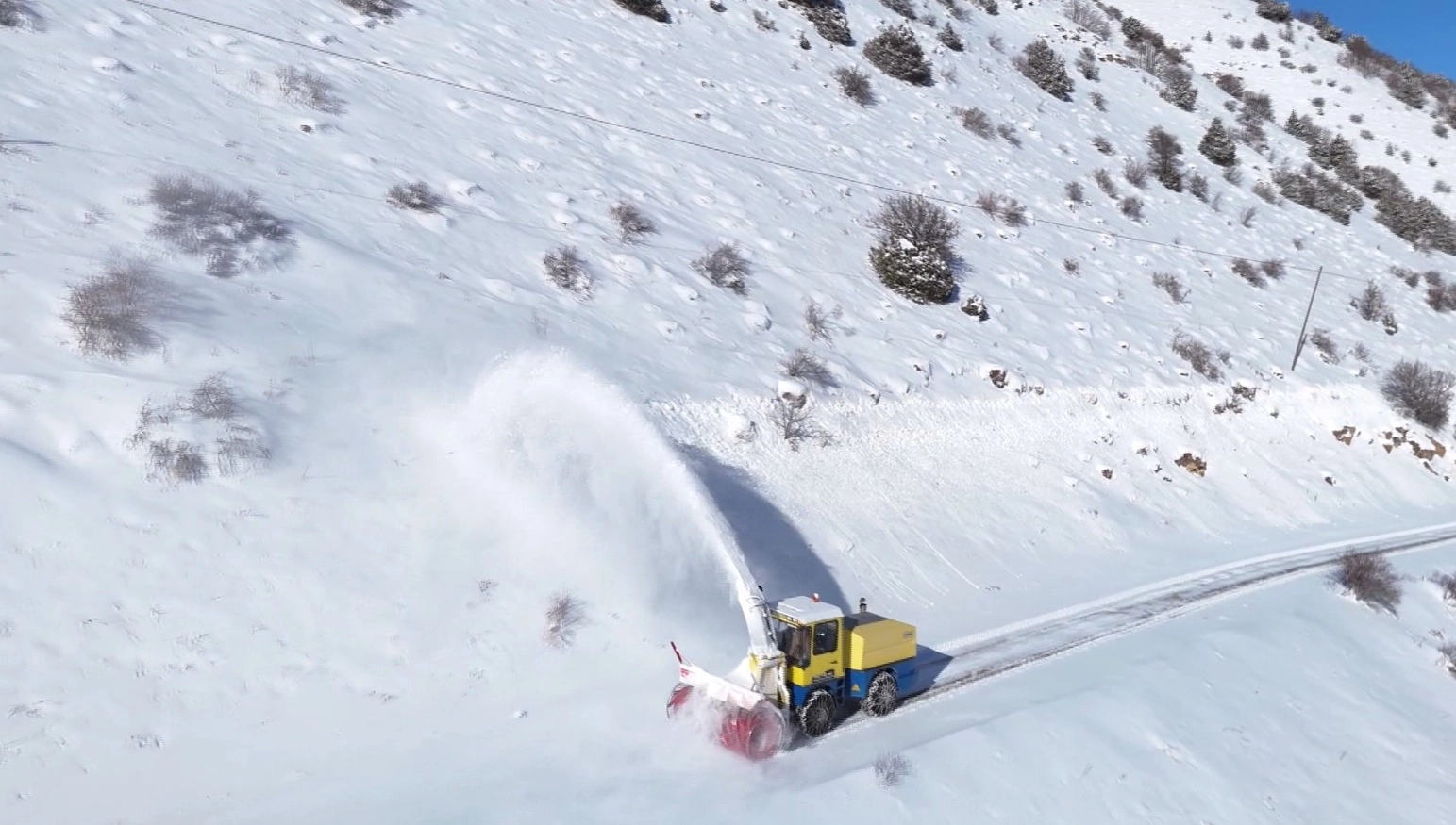 Murat SÖYLEMEZ/BAYBURT, (DHA)- BAYBURT’ta etkili olan kar yağışı nedeniyle ulaşıma kapanan 44 köy yolu, İl Özel İdaresi ekiplerinin çalışmasıyla yeniden ulaşıma açıldı. Karla mücadele kapsamında yürütülen çalışmalar dronla havadan görüntülendi.