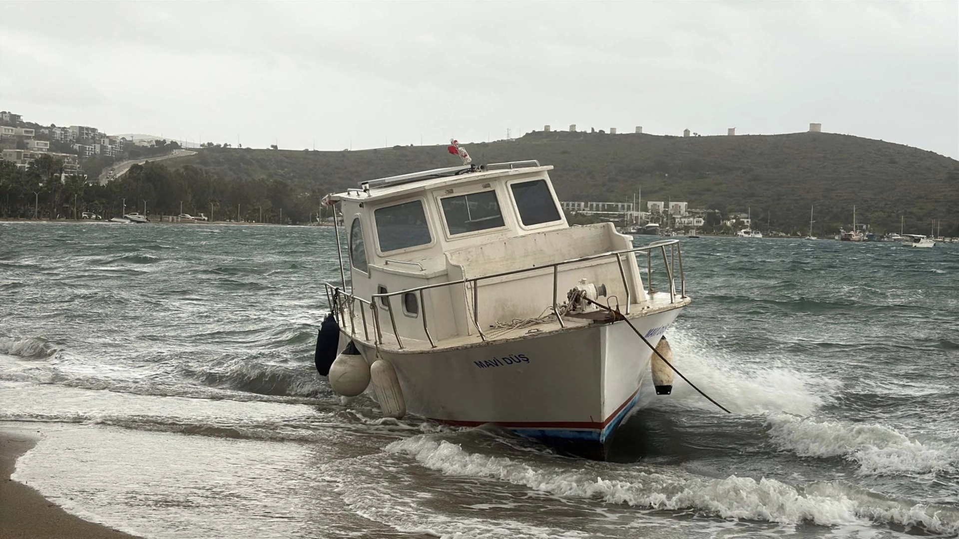 Fırat AKAY/ BODRUM(Muğla), (DHA)- MUĞLA’nın Bodrum ilçesinde, etkili olan fırtına nedeniyle 10 metre uzunluğundaki 'Mavi düş' isimli balıkçı teknesi karaya vurdu. Olumsuz hava koşulları nedeniyle yapılması planlanan Bodrum-Datça feribot seferi de iptal edildi.