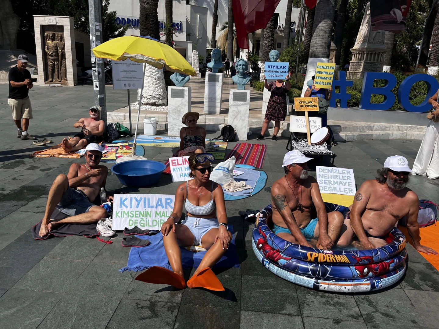 Fırat AKAY/ BODRUM (Muğla), (DHA)- MUĞLA'nın Bodrum ilçesinde kıyı işgallerine dikkat çekmek isteyen ve kendilerini 'Özgür Kıyılar Bodrum İnisiyatifi' olarak tanımlayan bir grup, kent meydanında şezlonglu, plaj havlulu ve şişme havuzlu eylem yaptı. Turistler tarafından ilgi çeken eylemde, denize giremediklerini söyleyen eylemciler meydanı plaj gibi kullanarak farkındalık oluşturdu.Özgür Kıyılar Bodrum İnisiyatifi tarafından Belediye Meydanı'nda kıyı işgallerine dikkat çekmek için farklı eylem gerçekleştirildi. Denize girecek yer bulamadıklarını söyleyen eylemciler, havlu, şezlong ve şişme havuzla meydana plaj havası oluşturdu. Eylemciler, 'Kıyılar halkındır', 'Kıyılar kimsenin malı değildir', 'Denize erişim herkesin hakkı' gibi dövizlerle slogan atarak tepkilerini dile getirdi. Bazı eylemciler birbirlerine güneş kremi sürdü, bazıları palet giydi, bazıları dalgıç gözlüğü takarak denize girer gibi davranarak turistlerin ilgisini çekti. Bölgedeki bazı vatandaşlar ve turistler eylemcilere alkışlarla destek verdi.'KIYIDA TEK SIRA YÜRÜYÜŞÜMÜZÜN BİLE MÜMKÜN OLMAYACAĞI ŞEKİLDE İŞGAL GÖRDÜK'Grup adına Selda Yeter ve Arif Sırrı Özçelik basın açıklaması yaptı. Basın açıklamasının bir kısmını okuyan Selda Yeter, "7 haftadır devam eden eylemlerimizde anayasanın yapılamaz dediği her usulsüzlüğün yüzsüzce yapıldığına şahit olduk. Kıyıda tek sıra yürüyüşümüzün bile mümkün olmayacağı şekilde; şemsiyeler, şezlonglar, masa ve sandalyeler ile kıyının işgal edildiğini gördük. Kıyıda; beton duvarlar, ahşap ve demir çitler, beton saksılar ile halkın kıyıya serbestçe geçişinin engellendiği basın mensupları tarafından ve tarafımızca kayda alındı. Tüm bu usulsüzlüklere rağmen kıyıya ulaşmak istediğimizde işletme sahiplerince sözlü ve fiziki saldırılara maruz kaldık. Güvenlik görevlilerinin ve bizlerin sağduyulu tutumu sayesinde eylemlerimize gölge düşürecek herhangi olay yaşanmasına fırsat vermedik. 7 hafta boyunca ne Bodrum Belediyesi'nden ne de Bodrum Kaymakamlığı'ndan bu yaşanalar ile ilgili en küçük bir tepki görmedik. Dedik ki madem plajlarda bize havlumuzu serecek yer yok, gidelim Belediye Meydanı'na havlularımızı serelim" dedi. (DHA)