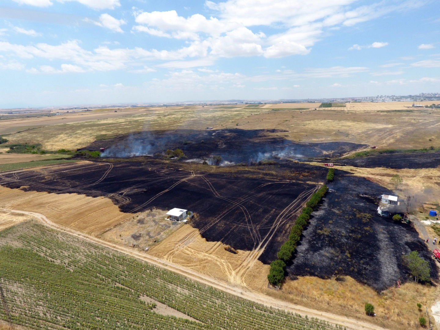 Mehmet YİRUN-Mehmetcan ARSLAN/ÇORLU (Tekirdağ), (DHA)-TEKİRDAĞ'ın Çorlu ilçesinde çiftlik içerisindeki barakada çıkan yangın, buğday ekili tarlaya sıçradı. Yangın 2 saatte söndürülürken, 10 dönüm alan zarar gördü. Çorlu ilçesine bağlı Şahpaz Mahallesi yolundaki çiftlik içerisindeki bir barakada, öğle saatlerinde yangın çıktı. Çevredekilerin ihbarıyla bölgeye Çorlu Belediyesi itfaiye ekipleri sevk edildi. Ekiplerin müdahale ettiği alevler, rüzgarın etkisiyle önce otluk alana ardından ekili buğday tarlasına sıçradı. Yangının büyümesi ile mahalleli de söndürme çalışmalarına destek verdi. Alevler, bölgeye yakın doğal gaz dağıtım vanasına ulaşmadan 2 saatlik çalışma sonucunda söndürüldü. Bölgeye gelen Çorlu İlçe Jandarma Komutanı Binbaşı Engin Türk, yangın hakkında bilgi aldı. Diğer yandan 10 dönüm alan zarar görürken, yangının çıkış nedeni için inceleme başlatıldı.(DHA)