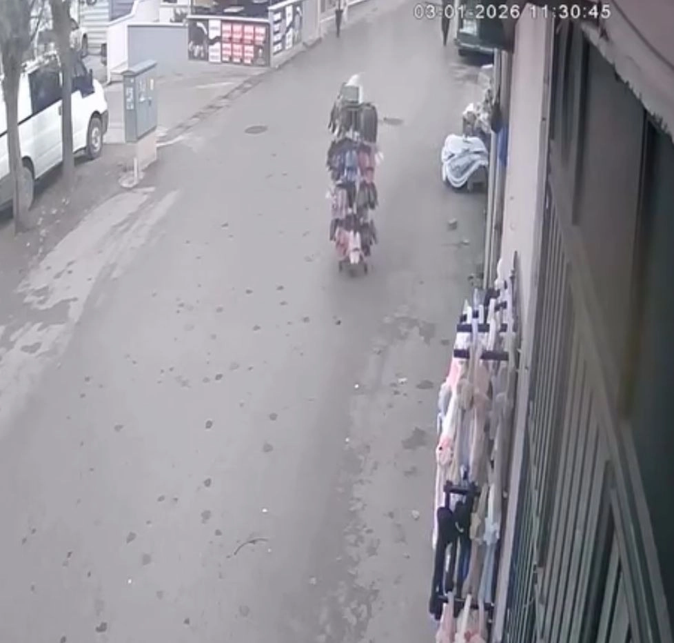 Bursa'da sabah saatlerinde başlayıp etkisini sürdüren lodos, yaşamı olumsuz etkiledi. Yıldırım ilçesi Esenevler Mahallesi'nde bulunan bir terlik standı, rüzgarın etkisiyle savrulurken; dükkan sahibi son anda standı tuttu. O anlar, bir apartmanın güvenlik kamerasına yansıdı.