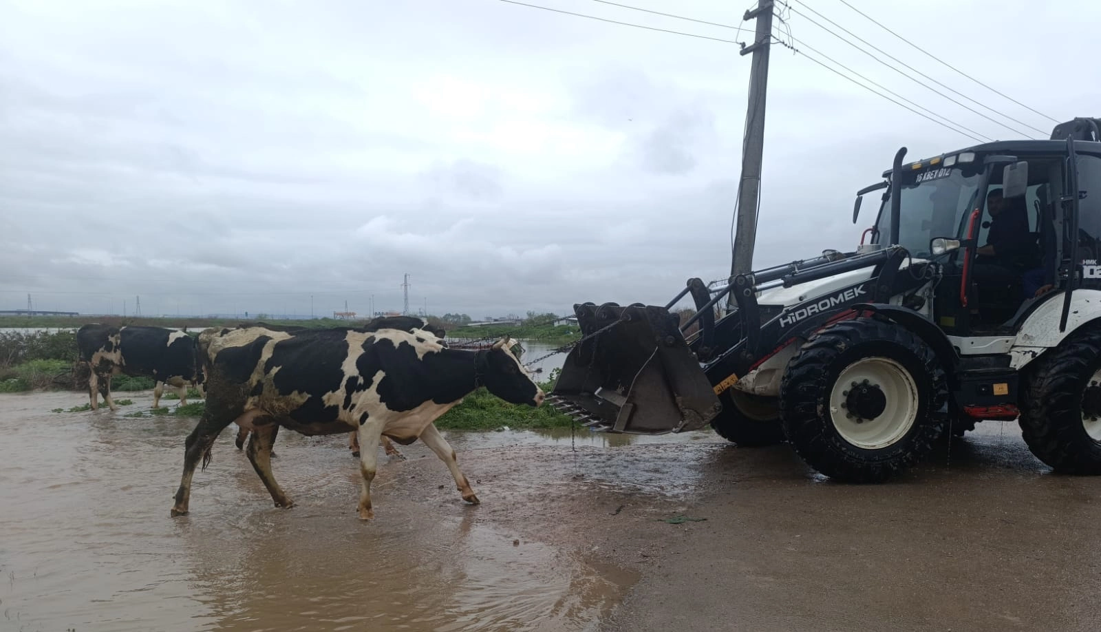 Bursa'nın Karacabey ilçesi Gazi Mahallesi Bayıraltı mevkisinde su altında kalan ahırlardaki büyükbaşlar, itfaiye ve AFAD ekipleri tarafından kurtarıldı. Bazı hayvanlar da iş makinelerine bağlanan halatlarla güvenli bölgeye alındı. O anlar, cep telefonuyla görüntülendi.
