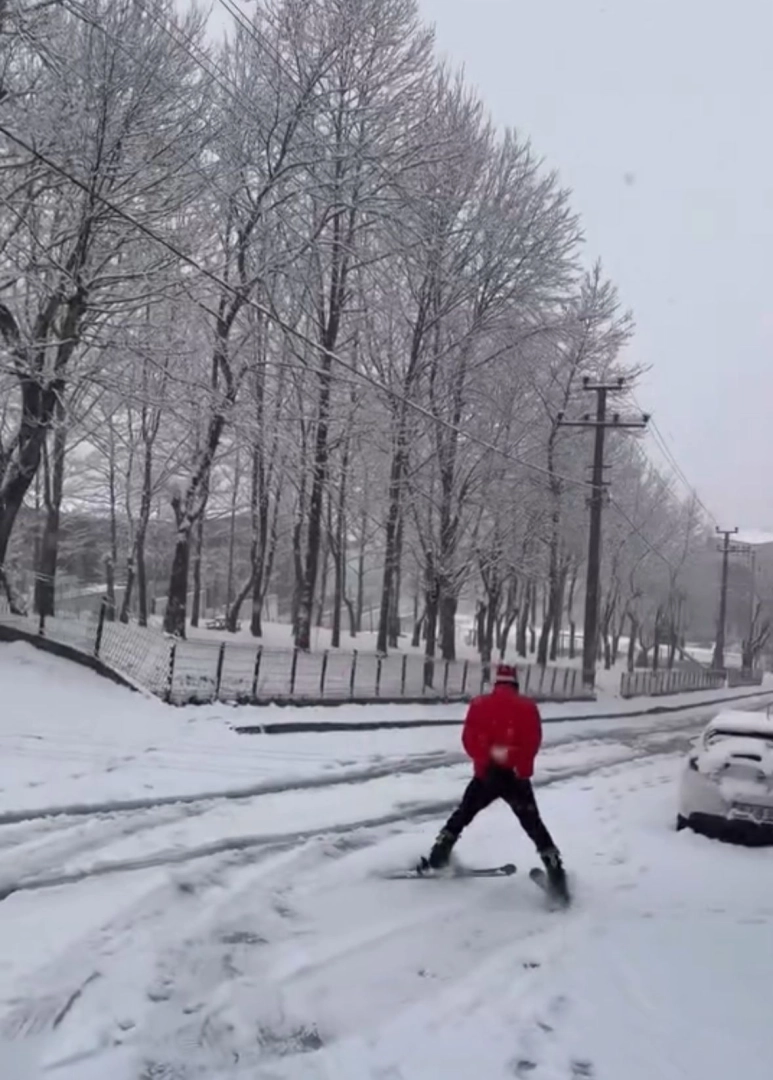 Bursa'da sabah saatlerinde başlayan kar yağışı aralıklarla etkisini sürdürürken, Yıldırım ilçesi Teleferik Mahallesi'nde bir kişi, kayak kıyafetlerini giyip snowboard ile yokuş aşağı indi. O anlar, bir başka kişi tarafından cep telefonuyla görüntülendi. (DHA)