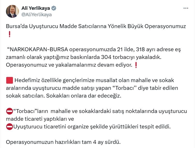 ANKARA, (DHA)- İÇİŞLERİ Bakanı Ali Yerlikaya, Bursa merkezli 21 ilde düzenlenen uyuşturucu operasyonunda 304 torbacının yakalandığını duyurdu.Bakan Yerlikaya, sosyal medya hesabından yaptığı açıklamada, "Narkokapan-Bursa' operasyonumuzda, 3 bin 190 polis, 452 ekip, 2 helikopter, 22 narkotik dedektör köpeği, 4 insansız hava aracının (İHA) katılımıyla Bursa merkezli 21 ilde 318 ayrı adrese yönelik operasyonlar gerçekleştirildi. Yaptığımız baskınlarda 304 torbacıyı yakaladık. Torbacıların mahalle ve sokaklardaki satış noktalarında uyuşturucu madde ticareti yaptıkları ve uyuşturucu ticaretini organize şekilde yürüttükleri tespit edildi. Operasyonumuzun hazırlıkları tam 4 ay sürdü. Bu 4 ay boyunca, adeta Bursa’nın bir kez daha röntgenini çektik. Saha çalışmalarımızı ve analizlerimizi büyük bir titizlikle gerçekleştirdik. Şüphelileri teknik ve fiziki takiple izledik. İşlenen suçlara dair tüm faaliyetleri tek tek delillendirdik ve düğmeye bastık" dedi.'HEDEFİMİZ SOKAK SATICILARI'Operasyona katılan ekipleri tebrik eden Yerlikaya, "Operasyonumuz ve yakalamalarımız devam ediyor. Hedefimiz özellikle gençlerimize musallat olan mahalle ve sokak aralarında uyuşturucu madde satışı yapan 'torbacı' diye tabir edilen sokak satıcıları. Sokakları onlara dar edeceğiz. Uyuşturucu, insanlığın en büyük düşmanıdır. Gençlerimizin hayatını çalmaya cüret eden, o zehir tacirleriyle ülkemiz ve insanlık adına mücadele etmeye devam edeceğiz" açıklamasında bulundu. (DHA)