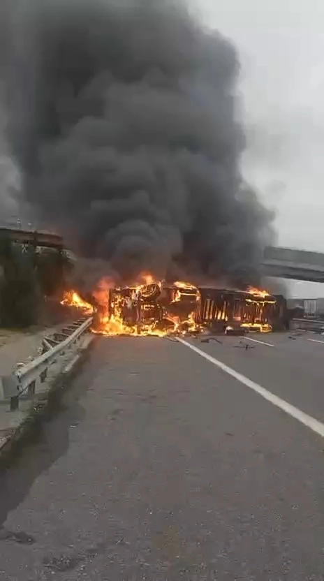 MERSİN, (DHA)- MERSİN'in Tarsus ilçesinde refüjdeki bariyerlere çarpıp, devrilen TIR, alev alev yandı. Sürücünün yara almadan kurtulduğu kazada karayolu yaklaşık 1 saat ulaşıma kapandı.Kaza, akşam saatlerinde Tarsus-Pozantı Otoyolu Damlama mevkisinde meydana geldi. Y.A. yönetimindeki 38 AGV 644 plakalı elyaf yüklü TIR, refüjdeki bariyerlere çarpıp, devrildikten sonra alev aldı. Sürücünün yara almadan kurtulduğu kazada TIR, yanmaya başladı. Çevredekilerin ihbarı üzerine olay yerine itfaiye ekipleri sevk edildi. Kaza ve yangın nedeniyle otoyol, trafiğe kapatıldı. İtfaiye ekiplerinin müdahalesiyle yangın, yaklaşık yarım saatte söndürüldü. Yangında kullanılmayacak hale gelen TIR'ın yoldan kaldırılmasının ardından otoyol yeniden trafiğe açıldı.Kazayla ilgili soruşturma başlatıldı. (DHA)