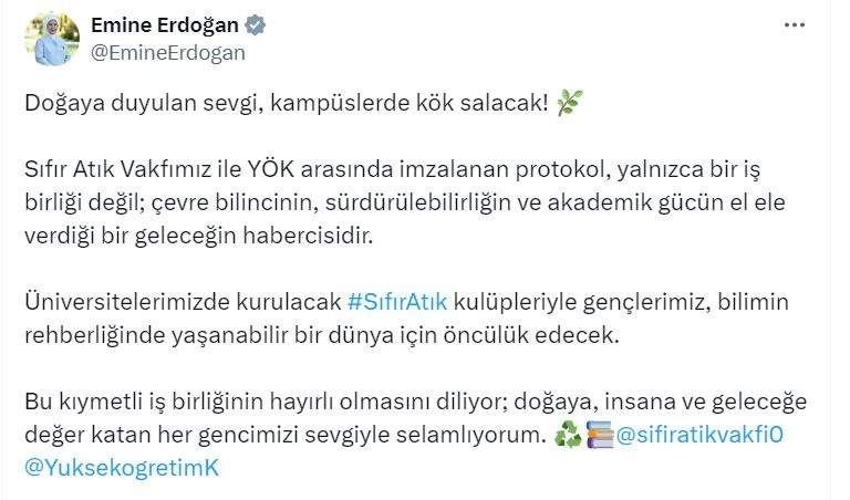 ANKARA, (DHA)- CUMHURBAŞKANI Recep Tayyip Erdoğan'ın eşi Emine Erdoğan, "Üniversitelerimizde kurulacak Sıfır Atık kulüpleriyle gençlerimiz, bilimin rehberliğinde yaşanabilir bir dünya için öncülük edecek" dedi.Emine Erdoğan, sosyal medya hesabından, Yükseköğretim Kurulu (YÖK) ile Sıfır Atık Vakfı arasında imzalanan 'Üniversitelerde Sıfır Atık Uygulamaları İşbirliği Protokolü'ne dair paylaşımda bulundu. Sıfır Atık Vakfının protokolle ilgili paylaşımını alıntılayan Erdoğan, "Doğaya duyulan sevgi, kampüslerde kök salacak. Sıfır Atık Vakfımız ile YÖK arasında imzalanan protokol, yalnızca bir iş birliği değil, çevre bilincinin, sürdürülebilirliğin ve akademik gücün el ele verdiği bir geleceğin habercisidir. Üniversitelerimizde kurulacak Sıfır Atık kulüpleriyle gençlerimiz, bilimin rehberliğinde yaşanabilir bir dünya için öncülük edecek. Bu kıymetli iş birliğinin hayırlı olmasını diliyor, doğaya, insana ve geleceğe değer katan her gencimizi sevgiyle selamlıyorum" ifadelerini kullandı. (DHA)