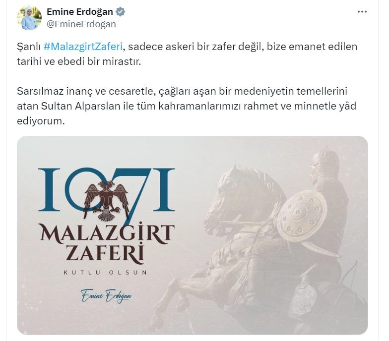 ANKARA, (DHA)- CUMHURBAŞKANI Recep Tayyip Erdoğan'ın eşi .Emine Erdoğan, sosyal medya hesabından paylaştığı mesajında, "Şanlı Malazgirt Zaferi, sadece askeri bir zafer değil, bize emanet edilen tarihi ve ebedi bir mirastır. Sarsılmaz inanç ve cesaretle, çağları aşan bir medeniyetin temellerini atan Sultan Alparslan ile tüm kahramanlarımızı rahmet ve minnetle yad ediyorum" ifadelerini kullandı. (DHA)