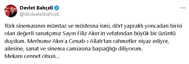 BAHÇELİ'DEN BAŞSAĞLIĞI PAYLAŞIMIMilliyetçi Hareket Partisi (MHP) Genel Başkanı Devlet Bahçeli, sosyal medya hesabından yaptığı paylaşımda, "Türk sinemasının mümtaz ve müstesna ismi, dört yapraklı yoncadan birisi olan değerli sanatçımız Sayın Filiz Akın’ın vefatından büyük bir üzüntü duydum. Merhume Akın’a Cenab-ı Allah’tan rahmetler niyaz ediyor, ailesine, sanat ve sinema camiasına başsağlığı diliyorum. Mekanı cennet olsun" ifadelerini kullandı. (DHA)