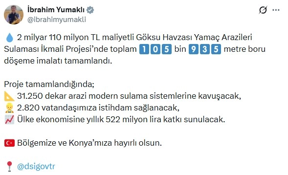 Bakan Yumaklı, sanal medya hesabından yaptığı açıklamada, "2 milyar 110 milyon TL maliyetli Göksu Havzası Yamaç Arazileri Sulaması İkmali Projesi'nde toplam 105 bin 935 metre boru döşeme imalatı tamamlandı. Proje tamamlandığında; 31 bin 250 dekar arazi modern sulama sistemlerine kavuşacak, 2 bin 820 vatandaşımıza istihdam sağlanacak, ülke ekonomisine yıllık 522 milyon lira katkı sunulacak. Bölgemize ve Konya'mıza hayırlı olsun" ifadelerini kullandı. (DHA)