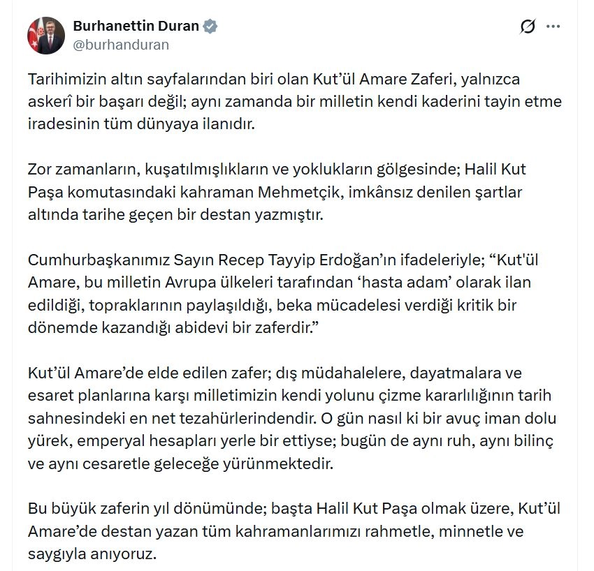 ANKARA, (DHA)- İLETİŞİM Başkanı Burhanettin Duran, "Tarihimizin altın sayfalarından biri olan Kut'ül Amare Zaferi, yalnızca askeri bir başarı değil; aynı zamanda bir milletin kendi kaderini tayin etme iradesinin tüm dünyaya ilanıdır" dedi.