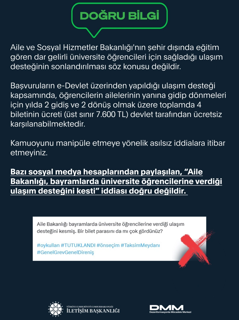 ANKARA, (DHA)- CUMHURBAŞKANLIĞI İletişim Başkanlığı Dezenformasyonla Mücadele Merkezi (DMM), "Bazı sosyal medya hesaplarından paylaşılan, 'Aile Bakanlığı, bayramlarda üniversite öğrencilerine verdiği ulaşım desteğini kesti' iddiası doğru değildir" açıklamasında bulundu.DMM'nin sosyal medya hesabından yapılan açıklamada, "Bazı sosyal medya hesaplarından paylaşılan, 'Aile Bakanlığı, bayramlarda üniversite öğrencilerine verdiği ulaşım desteğini kesti' iddiası doğru değildir. Aile ve Sosyal Hizmetler Bakanlığı'nın şehir dışında eğitim gören dar gelirli üniversite öğrencileri için sağladığı ulaşım desteğinin sonlandırılması söz konusu değildir. Başvuruların e-Devlet üzerinden yapıldığı ulaşım desteği kapsamında, öğrencilerin ailelerinin yanına gidip dönmeleri için yılda 2 gidiş ve 2 dönüş olmak üzere toplamda 4 biletinin ücreti (üst sınır 7.600 TL) devlet tarafından ücretsiz karşılanabilmektedir. Kamuoyunu manipüle etmeye yönelik asılsız iddialara itibar etmeyiniz" denildi. (DHA)