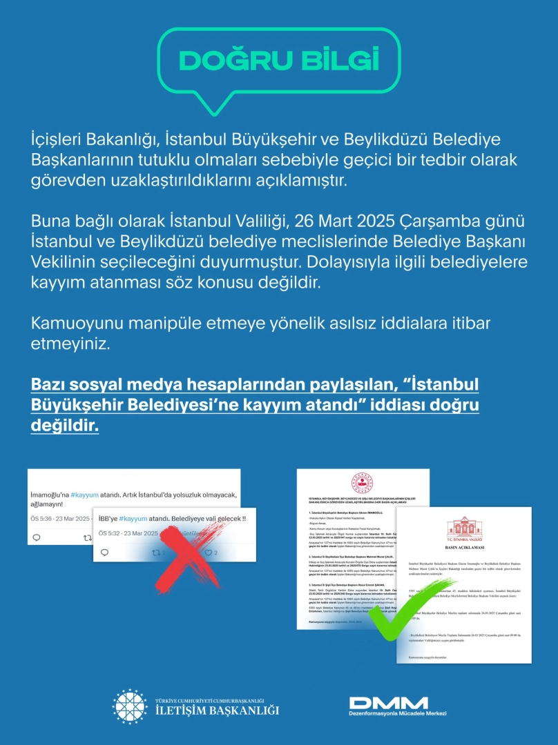 ANKARA, (DHA)- CUMHURBAŞKANLIĞI İletişim Başkanlığı Dezenformasyonla Mücadele Merkezi (DMM), "Bazı sosyal medya hesaplarından paylaşılan, 'İstanbul Büyükşehir Belediyesi’ne (İBB) kayyım atandı' iddiası doğru değildir" açıklamasında bulundu.DMM'nin sosyal medya hesabından yapılan açıklamada, "Bazı sosyal medya hesaplarından paylaşılan, 'İstanbul Büyükşehir Belediyesi’ne kayyım atandı' iddiası doğru değildir. İçişleri Bakanlığı, İstanbul Büyükşehir ve Beylikdüzü Belediye Başkanlarının tutuklu olmaları sebebiyle geçici bir tedbir olarak görevden uzaklaştırıldıklarını açıklamıştır. Buna bağlı olarak İstanbul Valiliği, 26 Mart 2025 Çarşamba günü İstanbul ve Beylikdüzü belediye meclislerinde Belediye Başkanı Vekilinin seçileceğini duyurmuştur. Dolayısıyla ilgili belediyelere kayyım atanması söz konusu değildir. Kamuoyunu manipüle etmeye yönelik asılsız iddialara itibar etmeyiniz" denildi. (DHA)