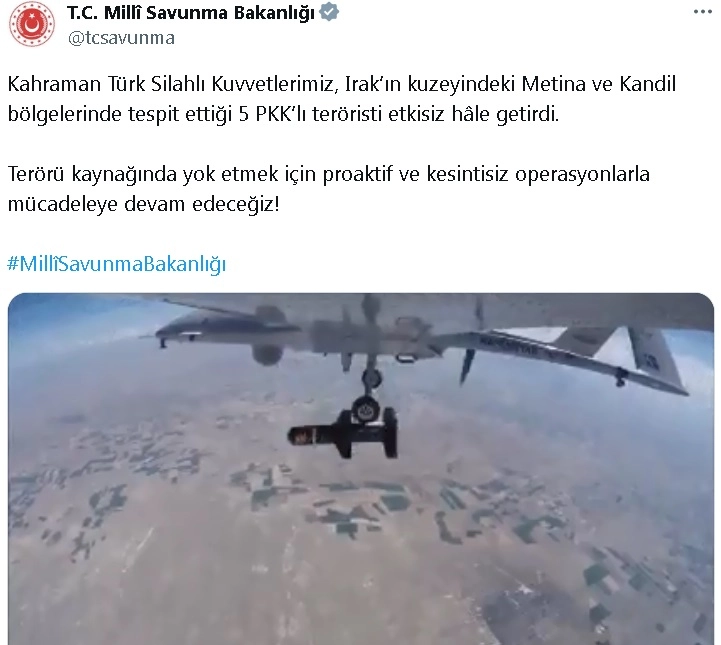 ANKARA, (DHA)- MİLLİ Savunma Bakanlığı (MSB), Irak’ın kuzeyindeki Metina ve Kandil bölgelerinde PKK’lı 5 teröristin etkisiz hale getirildiğini duyurdu.MSB'nin sosyal medya hesabı üzerinden yapılan açıklamada, "Kahraman Türk Silahlı Kuvvetlerimiz, Irak’ın kuzeyindeki Metina ve Kandil bölgelerinde tespit ettiği 5 PKK’lı teröristi etkisiz hale getirdi. Terörü kaynağında yok etmek için proaktif ve kesintisiz operasyonlarla mücadeleye devam edeceğiz" denildi. (DHA)