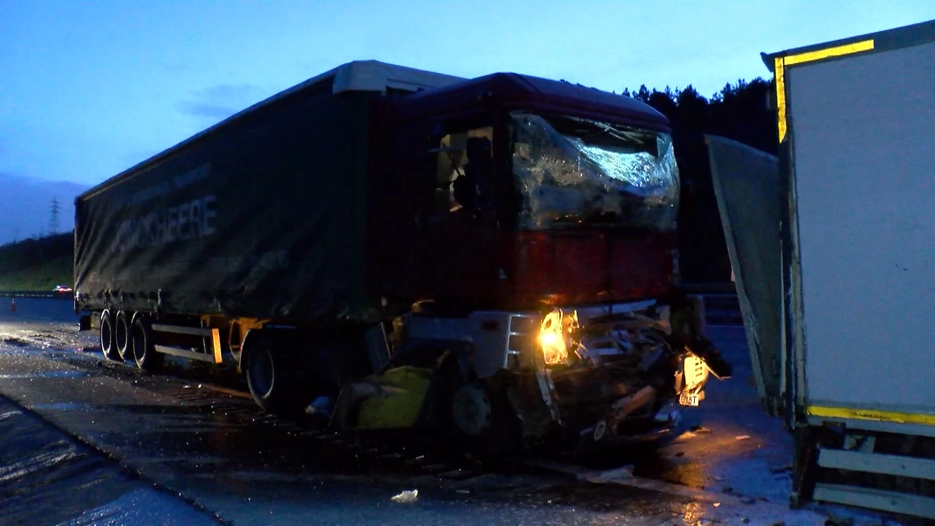 İsa ALMAÇAYIR/İSTANBUL,(DHA)-ÇEKMEKÖY Kuzey Marmara Otoyolu'nda kamyon ile iki TIR'ın karıştığı kazada, 2 sürücü yaralandı.Kaza, saat 06.00 sıralarında Kuzey Marmara Otoyolu Ömerli mevki, Ankara istikametinde meydana geldi. Edinilen bilgiye göre, sürücüsünün ismi öğrenilemeyen 55 EJ 683 plakalı kamyon, Servet Güler'in kullandığı akaryakıt istasyonundan çıkan 06 FG 8056 plakalı TIR'a arkadan çarptı. Bu sırada sürücüsünün direksiyon hakimiyetini yitirdiği kamyona, arkadan gelen CT 4131 BT Bulgaristan plakalı TIR çarptı. Kazada, 55 EJ 683 plakalı kamyon ile Bulgaristan plakalı TIR'ın şoförü araçta sıkışarak yaralandı. İhbar üzerine olay yerine itfaiye, jandarma ve sağlık ekipleri sevk edildi. Ekipler, bulundukları yerde sıkışan şoförleri kurtararak sağlık ekiplerine teslim etti. Sağlık ekipleri, yaralıları ilk müdahalenin ardından ambulansla hastaneye kaldırdı. Jandarma, kazayla ile ilgili inceleme başlattı.Kazayı yara almadan atlatan TIR şoförü Servet Güler, "Saat 05.00'da kalktık, sahurumuzu yaptık. Yakıtımı aldım yola çıktım. Yaklaşık 500 metre gitmeden aracım bir silkelendi. O an olayı tam anlayamadım, arabayı sağa doğru park ettim. Baktım bana arkadan çarpmışlar. Ben durup yanına gidene kadar, başka bir TIR'da o araca çarptı. Her iki aracın şoförü de sıkıştı. Durumları genel olarak iyi gibiydi." dedi. (DHA)