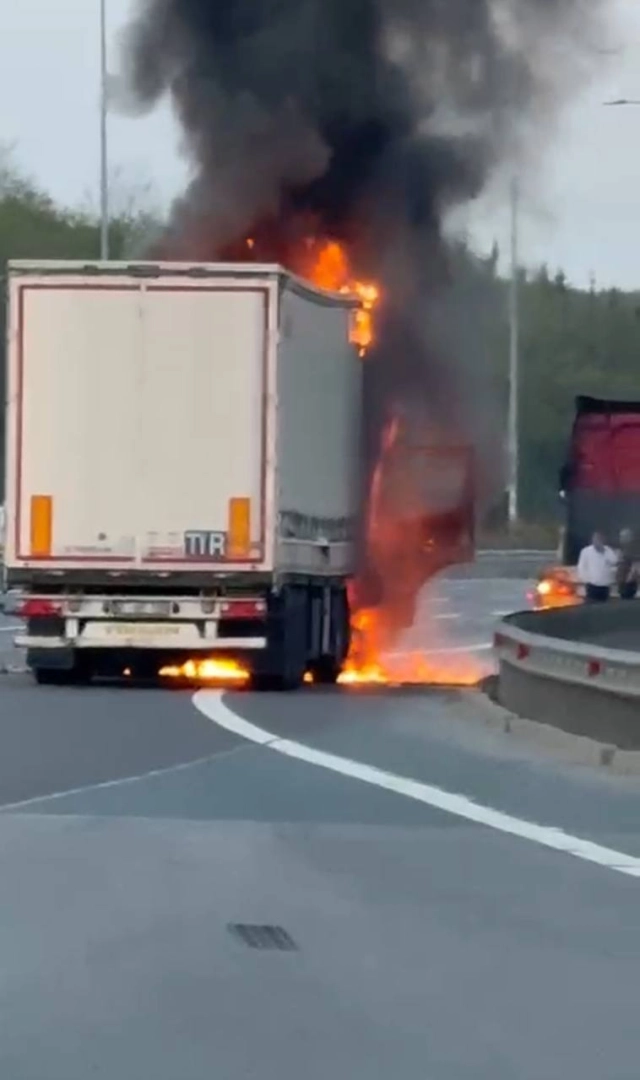 Vehbi DEMİR - Özcan KILIÇ / İSTANBUL, (DHA) - EYÜPSULTAN, Kuzey Marmara Otoyolu'nda seyir halinde olan TIR'ın motor bölümünde başlayan yangın kısa sürede büyüdü. Alev alev yanan TIR, itfaiye ekipleri tarafından söndürüldü.Yangın, saat 19.30 sıralarında Kuzey Marmara Otoyolu Işıklar mevkiinde seyir halinde olan TIR'ın motor bölümünde çıktı. Ankara istikametinde seyir halinde olan TIR'ın motor kısmında başlayan alevler kısa sürede büyüdü. İhbar üzerine olay yerine itfaiye ve jandarma ekipleri sevk edildi. Jandarma ekipleri çevrede güvenlik önlemi alırken, itfaiye ekipleri yangını söndürmek için çalışma başlattı. Kısa sürede kontrol altına alınan yangın itfaiye ekipleri tarafından söndürüldü. Yanan TIR ise kullanılamaz hale geldi. (DHA)