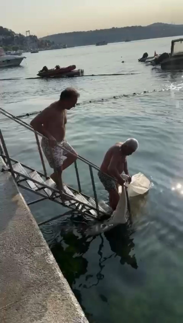 Doğan Can CESUR / İSTANBUL (DHA) -Bebek sahiline vuran yaklaşık 1,5 metre boyundaki ölü beyaz yunus, çevredekiler tarafından denizden çıkarılarak çöp konteynerine atıldı. O anlar cep telefonu kamerasıyla kaydedilirken yunusu çıkaran Azmi Yıldız, "Neden olduğunu bilemiyorum çok kötü bir şeydi. İnsan üzülüyor tabi" dedi.Olay, dün saat 08.00 sıralarında Bebek sahilinde meydana geldi. Edinilen bilgiye göre; denize girenler suda ters dönmüş beyaz yunus gördü. Öldüğü anlaşılan yaklaşık 1,5 metre uzunluğundaki yunusun çürümeye başladığı fark edildi. Çevredekilerin yardımıyla denizden çıkarılan yunus, poşete konularak çöp konteynerine atıldı. Yaşananlar ise cep telefonu kamerasıyla kaydedildi. 'ÇOK KÖTÜ BİR ŞEYDİ, ÜZÜLDÜK'Olayla ilgili konuşan Azmi Yıldız, “Her gün buraya yüzmeye geliyoruz. Kıyıdan geliyordu, ben ne olduğunu bilemedim. Yakına gelince bir bakayım dedim, baktım ki balık beyaz yunus balığıydı. Ölmüş, çıkartmaya çalıştım. Kardeşim Aydın'ı çağırdım beraber çıkarttık ve attık. Yarım saat sonra da fare geldi, onu da çıkarttık. Sonra çöp konteynerini caddeden buraya getirdim. Poşetleyip içerisine attık. Çok büyüktü. Hiç olmuyordu ilk defa gördüm. Neden olduğunu bilemiyorum çok kötü bir şeydi. Herhalde yani üzüldük, insan tabi üzülüyor. Çok eski ölmüş, yeni değildi. Kokmuş ve kavurgaları iskeletleri dışarıya çıkmış, hayvan parçalanmıştı" dedi.(DHA)