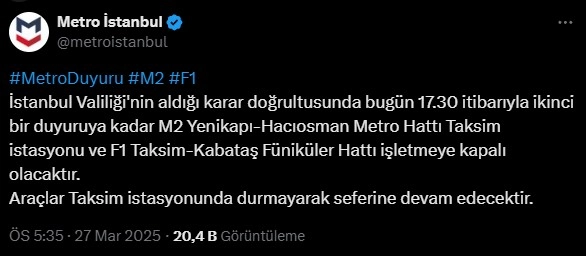 İSTANBUL,(DHA) - İSTANBUL Valiliği'nin kararı ile M2 Yenikapı - Hacıosman Metro Hattı'nın Taksim istasyonu ve F1 Taksim - Kabataş Füniküler Hattı ikinci bir duyuruya kadar işletmeye kapatıldı. İstanbul Valiliği tarafından, M2 Yenikapı - Hacıosman Metro Hattı'nın Taksim istasyonu ve F1 Taksim - Kabataş Füniküler Hattı'nın ikinci bir duyuruya kadar işletmeye kapatılmasına karar verildi. Karar, Metro İstanbul'un resmi sosyal medya hesabından yapılan paylaşım ile duyuruldu. (DHA)