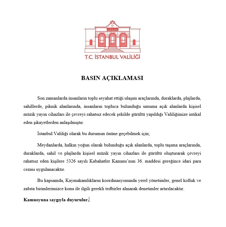 İSTANBUL, (DHA)- İstanbul Valiliği, Meydanlarda, halkın yoğun olarak bulunduğu açık alanlarda, toplu taşıma araçlarında, duraklarda, sahil ve plajlarda kişisel müzik yayın cihazları ile gürültü oluşturarak çevreyi rahatsız eden kişilere para cezası yazılacağını bildirdi. Valilikten yapılan açıklamada; Son zamanlarda insanların toplu seyahat ettiği ulaşım araçlarında, duraklarda, plajlarda, sahillerde, piknik alanlarında, insanların topluca bulunduğu umuma açık alanlarda kişisel müzik yayın cihazları ile çevreyi rahatsız edecek şekilde gürültü yapıldığı Valiliğimize intikal eden şikayetlerden anlaşılmıştır. İstanbul Valiliği olarak bu durumun önüne geçebilmek için; Meydanlarda, halkın yoğun olarak bulunduğu açık alanlarda, toplu taşıma araçlarında, duraklarda, sahil ve plajlarda kişisel müzik yayın cihazları ile gürültü oluşturarak çevreyi rahatsız eden kişilere 5326 sayılı Kabahatler Kanunu'nun 36. maddesi gereğince şahıslara bin 406 lira, işletmelere ise 30 bin 478 liradan 152 bin 895 liraya kadar para cezası uygulanacaktır. Bu kapsamda, Kaymakamlıkların koordinasyonunda yerel yönetimler, genel kolluk ve zabıta birimlerimizce konu ile ilgili gerekli tedbirler alınarak denetimler artırılacaktır." denildi.