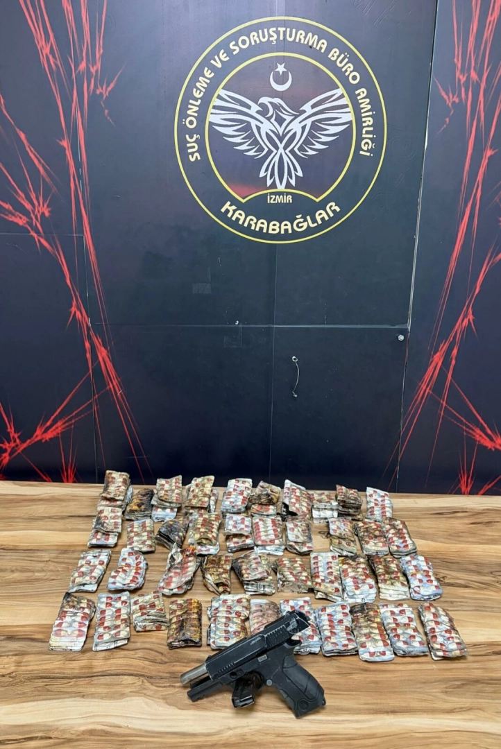 Karabağlar İlçe Emniyet Müdürlüğü'ne bağlı ekipler dün, Limontepe Mahallesi'nde silahla ev basıldığı ihbarı üzerine bölgeye gitti. Evde yangın çıktığını gören ekipler, olay yerinden dışarı çıkan 7 şüphelinin bölgeden ayrılmasına izin vermedi. İtfaiye ekiplerinin yangına müdahalesinin ardından evde ve bitişiğindeki diğer evde arama yapan polis, 1 ruhsatsız tabanca, 2 bin 926 uyuşturucu ecza, 3 fişek ve 1 kovan ele geçirdi.