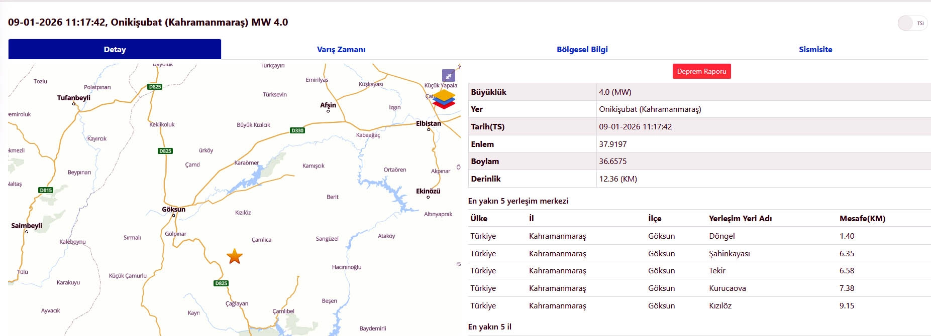 Afet ve Acil Durum Yönetimi (AFAD) Başkanlığı verilerine göre saat 11.17’de merkez Onikişubat ilçesinde 4 büyüklüğünde deprem oldu. Yerin 12,36 kilometre derinliğinde meydana gelen depremde, ilk bilgilere göre herhangi bir binada hasar veya olumsuzluğun yaşanmadığı belirtildi. (DHA)