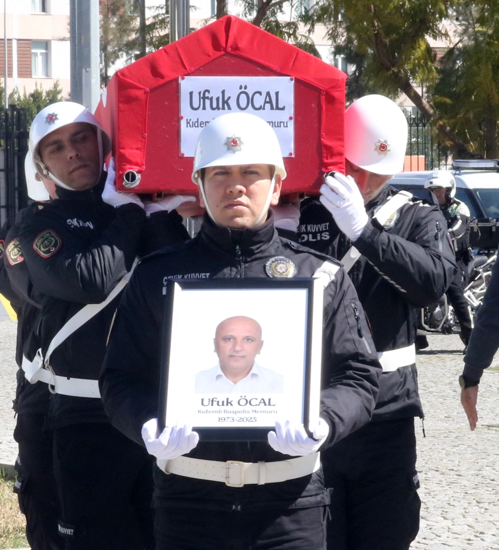 Adem AKALAN/ANTALYA, (DHA)- AKCİĞER kanseri tedavisi sırasında yaşamını yitiren Antalya Emniyet Müdürlüğü Asayiş Şube Müdürlüğü Cinayet Büro Amirliği'nde görevli kıdemli başpolis Ufuk Öcal (52) için Emniyet Müdürlüğü binasında veda töreni yapıldı.İl Emniyet Müdürlüğü Asayiş Şube Müdürlüğü Cinayet Büro Amirliği'nde görevli kıdemli başpolis Ufuk Öcal'a yaklaşık 3 ay önce yapılan tetkikleri sonucu akciğer kanseri teşhisi konuldu. Ankara Atatürk Sanatoryum Eğitim ve Araştırma Hastanesi'nde tedaviye alınan Ufuk Öcal, dün akşam hayatını kaybetti. Öcal için bugün Antalya Emniyet Müdürlüğü Hizmet Binası'nda veda töreni düzenlendi.İl Emniyet Müdürü İlker Arslan, emniyet müdür yardımcıları, şube müdürleri, Öcal'ın çalışma arkadaşları, eşi Yasemin Öcal, kızları Meryem Sena, Ceylin, Ayşe Nehir ve yakınları törene katıldı. Saygı duruşuyla başlayan törende Ufuk Öcal'ın öz geçmişi okundu. Öcal'ın yakınları, törende gözyaşlarını tutamadı ve ayakta durmakta da zorluk çekti. Duaların edilmesinden sonra Ufuk Öcal'ın Türk bayrağına sarılı tabutu tören mangası tarafından omuzlara alındı. Cinayet Büro Amirliği'nde görevli mesai arkadaşları da hep birlikte tabuta omuz verdi.Omuzlarda taşınarak cenaze aracına konulan Ufuk Öcal, toprağa verilmek üzere Konyaaltı'ndaki Boğaçayı Mezarlığı'na götürüldü. Cinayet Büro Amirliği'nde yıllardır görev yapan, çalışkanlığı ve mesleğine olan tutkusuyla bilinen Ufuk Öcal'ın sayısız asayiş olayının aydınlatılmasında öncü olduğu belirtildi. (DHA)