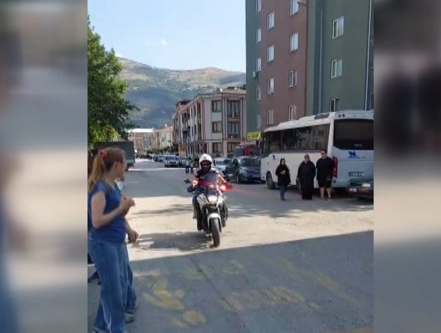 Kazım BULUT/GEMLİK (Bursa), (DHA)-BURSA’nın Gemlik ilçesinde, Liselere Geçiş Sistemi (LGS) kapsamındaki merkezi sınava girmek için geldiği okul önünde kimliğini unuttuğunu fark eden öğrenci, motosikletli trafik polisi tarafından sınava yetiştirildi. Milli Eğitim Bakanlığı tarafından 8'inci sınıf öğrencileri için düzenlenen LGS’ye, Bursa’da 139 okul, 2 bin 618 salonda, 40 bin 417 öğrenci katıldı. 5 bin 800 öğretmenin görev aldığı sınav kapsamında 810 polis de okul çevrelerinde güvenliği sağladı. Saat 09.30'da başlayan ve Türkçe, T.C. İnkılap Tarihi ve Atatürkçülük, Din Kültürü ve Ahlak Bilgisi ile Yabancı Dil sorularının yer aldığı ilk oturum saat 10.45'te sona ererken, 11.30'da başlayan 2’nci oturum ise saat 12.50'de bitti. Gemlik ilçesi Şehit Esat Akbaba Okulu'nda LGS’ye girecek bir öğrenci, kimliğini evinde unuttuğunu fark etti. Öğrenciyi, evine götürün ve kimliğini almasını sağlayan motosikletli trafik polisi, son anda onu sınava yetiştirdi. Okul çevresinde çocuklarını bekleyen veliler de o anları cep telefonuyla görüntüledi. (DHA)