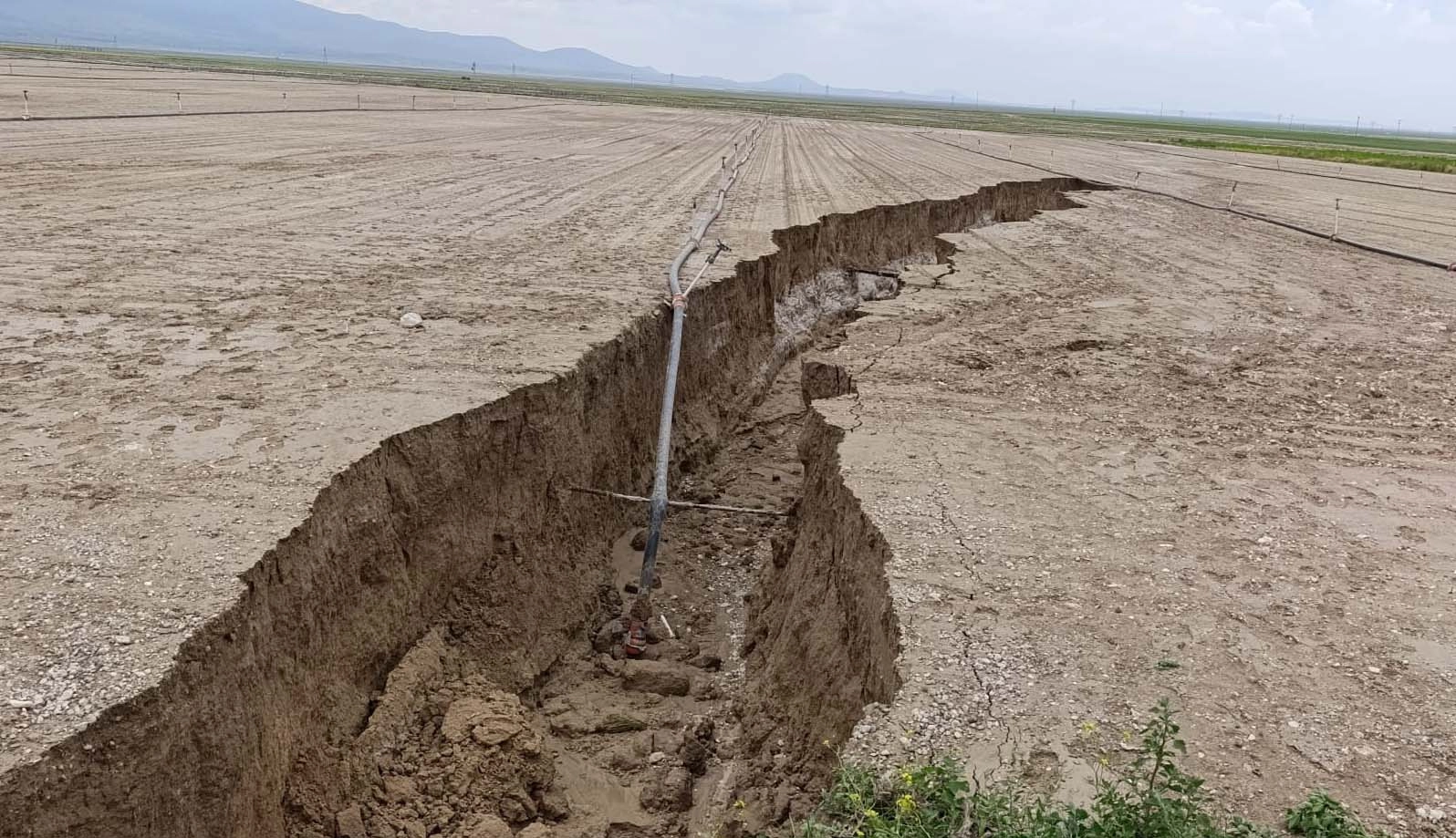 Mehmet OKUYUCU/KARAPINAR, (Konya), (DHA)- KONYA'nın Karapınar ilçesinde yoğun yağmur yağışı sonrası tarlada yüzey yarığı oluştu.Karapınar ilçesinde yer altı sularının çekilip toprağın göçmesiyle oluşan obrukların yanı sıra yüzey yarıkları bölgede görülmeye başladı. Kayalı Mahallesi Tilki Yaylasındaki tarlada, bugünkü yoğun yağış sonrası yüzey yarıkları oluştu. Tarla sahibi Nazım Karagöz, tarlasında daha önce çatlaklıkların olduğunu belirterek, “Tilkili Yaylasında 10 dekar buğday tarlamız ve 27 dekar pancar tarlamız var. Her iki tarlanın ortasından da asfalt yol geçiyor. Arazimizde çatlaklıklar vardı. Kuraklık nedeniyle olduğunu düşündüğümüzden önemsemedik. Yoğun yağış sonrası çatlaklıklar büyüyüp, yaklaşık 3-5 metre derinliğinde ve 100 metre uzunluğunda yarık oluştu. Yarık, buğday tarlasından başlayıp, yolun altından, pancar tarlasında ilerliyor. Bu durumu fark edince belediye ekiplerine haber verdik. Ekipler, yolun tadilatını yaptı. Tarlamız da bu hale dönüştü.'' (DHA)