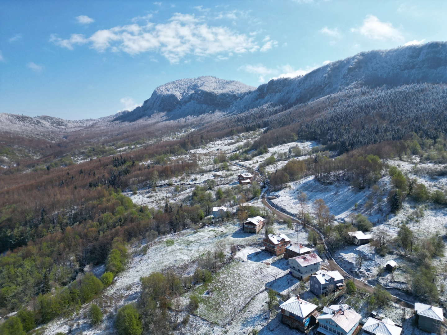 Ayhan ACAR/BARTIN, (DHA)- BARTIN ile Kastamonu sınırları içerisinde yer alan Küre Dağları Milli Parkı, nisan ayında yeşeren ağaçların üzerine yağan kar ile eşsiz güzelliğe büründü. İki mevsimin bir arada yaşandığı milli parktaki manzara, dronla görüntülendi.Korunan Alanlar Ağı Parkları (PAN Parks) sertifikası alarak, Avrupa'nın özel 13 noktasından biri seçilen Küre Dağları Milli Parkı'nda kar yağışı etkili oldu. 37 bin 753 hektar alana sahip milli park, doğaseverlerden yoğun ilgi görürken, özellikle Zoni Yaylası, Karadere çayırları, Büyük ve Küçük Küre geçişleri, Kerpiçli ve Göksu köyleri, Drahna Vadisi, Armutlu çayırı ve Kemerli Mağarası'ndaki kar manzarası hayran bırakıyor.YEMYEŞİL AĞAÇLARIN ÜZERİNDE KAR GÜZELLİĞİKüre Dağları Milli Parkı'nın Bartın’ın Arıt köylerindeki bölümlerinde 1400 rakıma ulaşan dağlarda kar yağışı etkili oldu. Yağış sonrası bölgede kar kalınlığı 10 santime ulaştı. Her mevsim ayrı güzelliğe bürünen milli parkta kar yağışının durmasıyla güneş yeniden ortaya çıktı. Kış mevsiminin tüm güzelliklerini içinde barındıran milli parkta manzaralar, ziyaretçileri hayran bıraktı. Milli parkın zirvesindeki 'uzun çarşı' bölümünde doyumsuz manzaralar ortaya çıktı. Milli parkın eteklerinde bulunan beyaz örtüyle kaplanan Sıralı, Esbey, Söğütlü, Aydınlar, Çorak, Hoşköy, Hatipler, Ören, İmamlar, Yeniköy, Umar, Turanlar, Çöpbey ve Hıdırlı köyleri ve eşsiz güzellikteki dağlar dronla görüntülendi. (DHA)