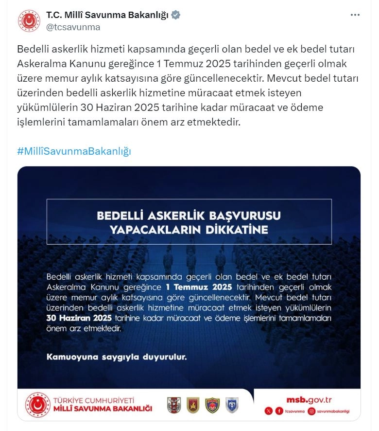 ANKARA, (DHA)- MİLLİ Savunma Bakanlığı (MSB), bedelli askerlik hizmeti kapsamında geçerli olan bedel ve ek bedel tutarının 1 Temmuz'da güncelleneceğini hatırlatarak, "Mevcut bedel tutarı üzerinden bedelli askerlik hizmetine müracaat etmek isteyen yükümlülerin 30 Haziran 2025 tarihine kadar müracaat ve ödeme işlemlerini tamamlamaları önem arz etmektedir" açıklamasını yaptı.Bakanlığın sosyal medya hesabından yapılan açıklamada, "Bedelli askerlik hizmeti kapsamında geçerli olan bedel ve ek bedel tutarı Askeralma Kanunu gereğince 1 Temmuz 2025 tarihinden geçerli olmak üzere memur aylık katsayısına göre güncellenecektir. Mevcut bedel tutarı üzerinden bedelli askerlik hizmetine müracaat etmek isteyen yükümlülerin 30 Haziran 2025 tarihine kadar müracaat ve ödeme işlemlerini tamamlamaları önem arz etmektedir" denildi. (DHA)