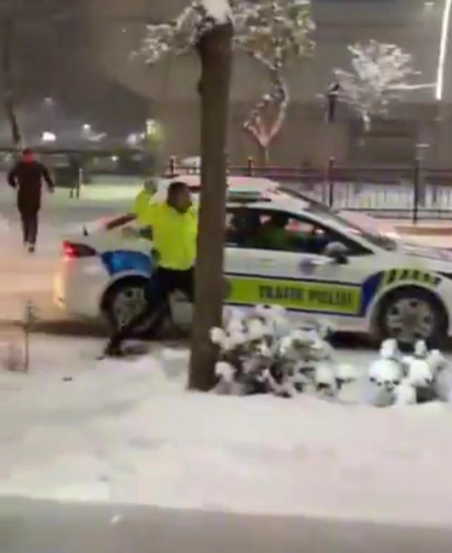 Kentte etkili olan kar yağışı sonrası Turgut Özal Bulvarı’nda polislerle gençler bir süre kar topu oynadı. O anlar, çevredekiler tarafından cep telefonu kamerasıyla kaydedildi. Görüntülerde, polislerin kısa süreliğine gençlerin oyununa eşlik ettiği görüldü. (DHA)