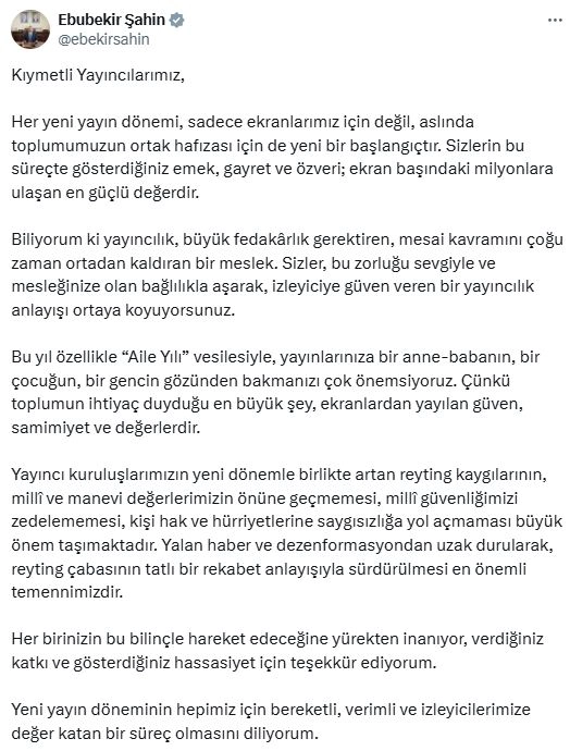 ANKARA, (DHA)- RADYO ve Televizyon Üst Kurulu (RTÜK) Başkanı Ebubekir Şahin, yeni yayın döneminin başlaması nedeniyle 'hayırlı olsun' mesajı paylaştı.RTÜK Başkanı Şahin, sosyal medya hesabından paylaştığı mesajda, "Kıymetli yayıncılarımız; her yeni yayın dönemi, sadece ekranlarımız için değil, aslında toplumumuzun ortak hafızası için de yeni bir başlangıçtır. Sizlerin bu süreçte gösterdiğiniz emek, gayret ve özveri; ekran başındaki milyonlara ulaşan en güçlü değerdir. Biliyorum ki yayıncılık, büyük fedakarlık gerektiren, mesai kavramını çoğu zaman ortadan kaldıran bir meslek. Sizler, bu zorluğu sevgiyle ve mesleğinize olan bağlılıkla aşarak, izleyiciye güven veren bir yayıncılık anlayışı ortaya koyuyorsunuz. Bu yıl özellikle 'Aile Yılı' vesilesiyle, yayınlarınıza bir anne-babanın, bir çocuğun, bir gencin gözünden bakmanızı çok önemsiyoruz. Çünkü toplumun ihtiyaç duyduğu en büyük şey, ekranlardan yayılan güven, samimiyet ve değerlerdir" ifadelerini kullandı. Artan reyting kaygılarının, milli ve manevi değerlerin önüne geçmemesi gerektiğini vurgulayan Şahin, "Yayıncı kuruluşlarımızın yeni dönemle birlikte artan reyting kaygılarının, milli ve manevi değerlerimizin önüne geçmemesi, milli güvenliğimizi zedelememesi, kişi hak ve hürriyetlerine saygısızlığa yol açmaması büyük önem taşımaktadır. Yalan haber ve dezenformasyondan uzak durularak, reyting çabasının tatlı bir rekabet anlayışıyla sürdürülmesi en önemli temennimizdir. Her birinizin bu bilinçle hareket edeceğine yürekten inanıyor, verdiğiniz katkı ve gösterdiğiniz hassasiyet için teşekkür ediyorum. Yeni yayın döneminin hepimiz için bereketli, verimli ve izleyicilerimize değer katan bir süreç olmasını diliyorum" açıklamasında bulundu. (DHA)